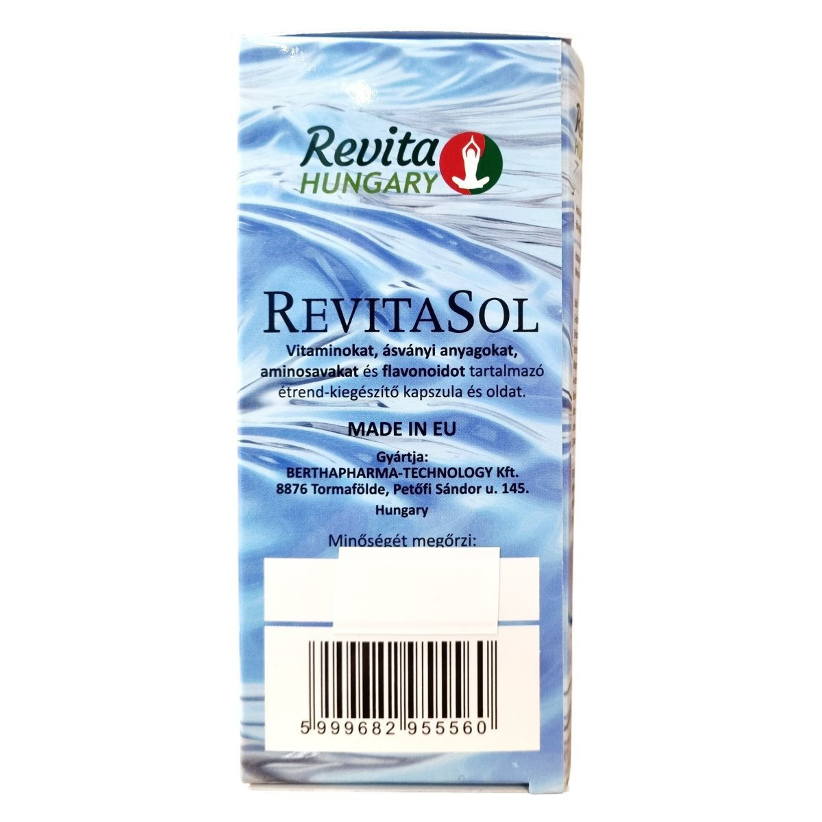 A RevitaSol termék egy szabadalmaztatott technológiával készült étrend-kiegészítő, amely egyesíti a vitaminok, ásványi anyagok, aminosavak és flavonoidok előnyeit. A zsírban oldódó vitaminok nemzetközi szabadalom alapján vizes oldat formájában kerülnek a készítménybe, így támogatva a hatékony felszívódást. A csomagolás 30 darab kapszulát és 100 ml oldatot tartalmaz. Az adagolás során egy evőkanál folyadékot és egy kapszulát ajánlott közvetlenül az első napi étkezés előtt fogyasztani. A termék nem helyettesíti a vegyes étrendet és az egészséges életmódot. A folyadékot felbontás után hűtve kell tárolni és 30 napon belül el kell fogyasztani, a kapszulát pedig száraz, hűvös helyen kell tartani. A termék az Európai Unióban készül, gyártója a BERTHAPHARMA-TECHNOLOGY Kft. Tormaföldén.