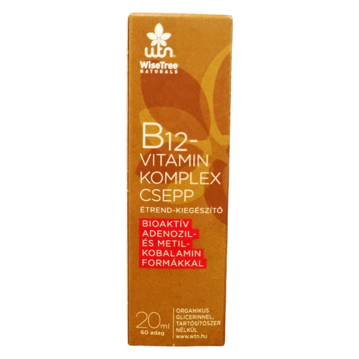 A WiseTree NATURALS B12-vitamin komplex csepp egy bioaktív adenozil- és metil-kobalamin formákat tartalmazó étrend-kiegészítő, amely organikus glicerinből készül, tartósítószer nélkül. A termék 20 ml-es kiszerelésű, és 60 adagot tartalmaz. A cseppet napi 6 cseppben javasolt alkalmazni, amelyet nyelv alá kell cseppenteni, majd körülbelül 30 másodpercig ott tartani a jobb felszívódás érdekében. Az összetevők között megtalálható a metil-kobalamin, az adenozil-kobalamin, valamint a 6(S)-L-metiltetrahidrofolát és inozitol-hexanikotinát is. A termék a B12-vitaminon kívül B9-vitamint is tartalmaz, amely L-5-MTHF formában van jelen. A készítményt a Wise Tree Kft. gyártja és forgalmazza. A termék fogyasztása nem helyettesíti a változatos, kiegyensúlyozott étrendet és az egészséges életmódot, továbbá fontos az ajánlott napi mennyiség betartása.