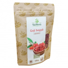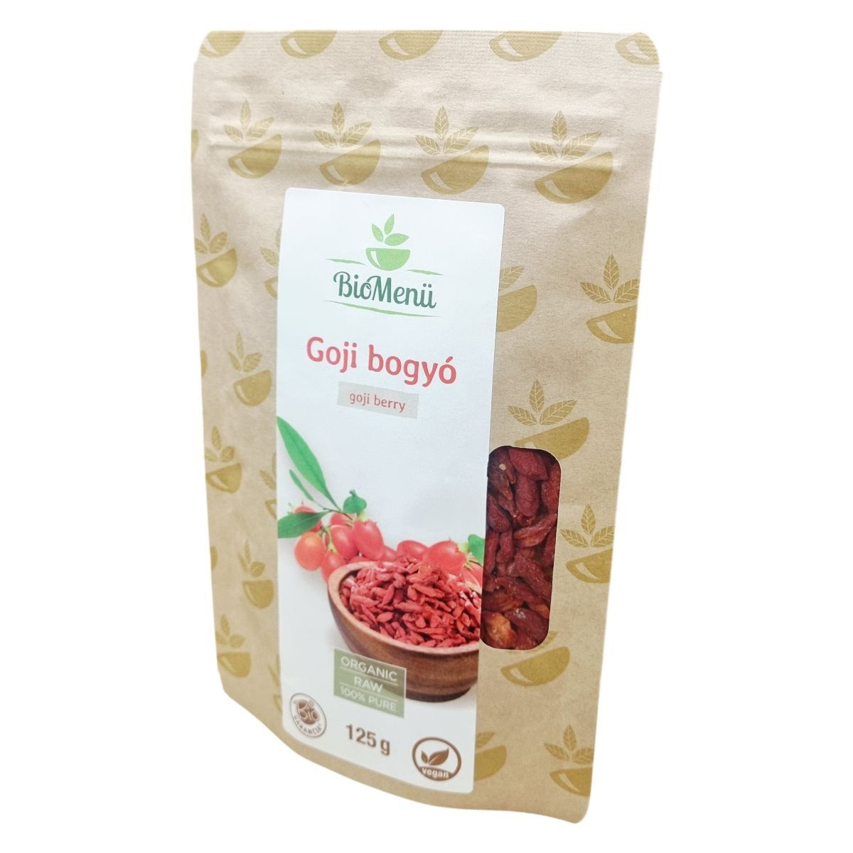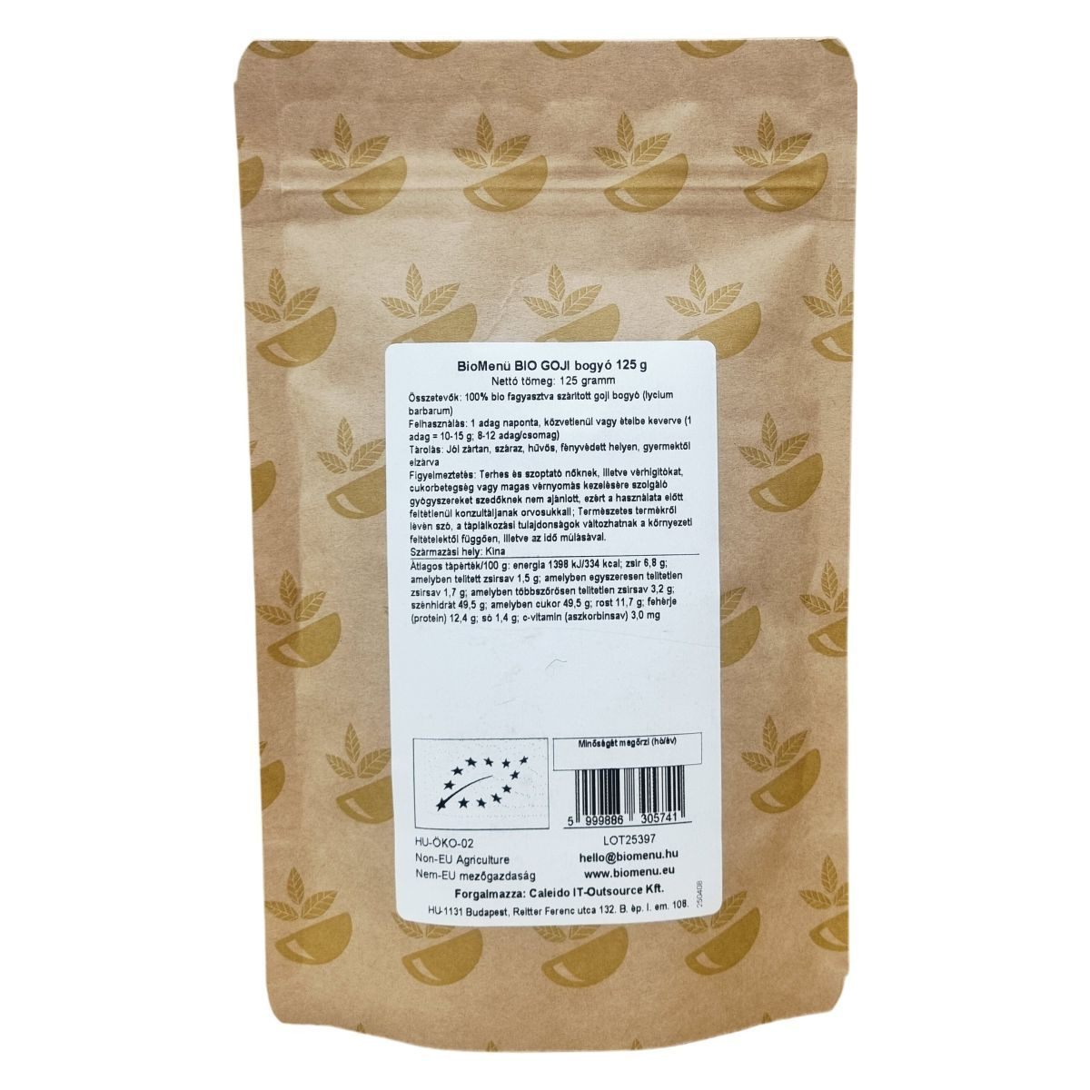 A BioMenü BIO GOJI bogyó 125 gramm kiszerelésben, Kínában termesztett, természetes alapanyagból készül. 100%-ban bio minőségű, fagyasztva szárított termék, melyet a BioGarancia tanúsít. A csomagolás megfelel a vegán és organikus életmód igényeinek. A termék összetétele és tápértéke részletesen fel van tüntetve, és a bio minősítés garantálja a természetes összetevők jelenlétét. A felhasználási javaslat szerint napi egy adag javasolt, amelyet közvetlenül vagy különféle ételekhez adva lehet fogyasztani. A használat során azonban ajánlott figyelembe venni a figyelmeztetéseket, különösen bizonyos egészségügyi állapotok illetve gyógyszeres kezelések esetén. A csomagolás jelölései között megtalálható az EU bio logó és a származási hely megjelölése is, így a vásárló megbízható terméket kap. A termék a legjobb minőség megőrzése érdekében száraz, hűvös, és fényvédett környezetben tartható.