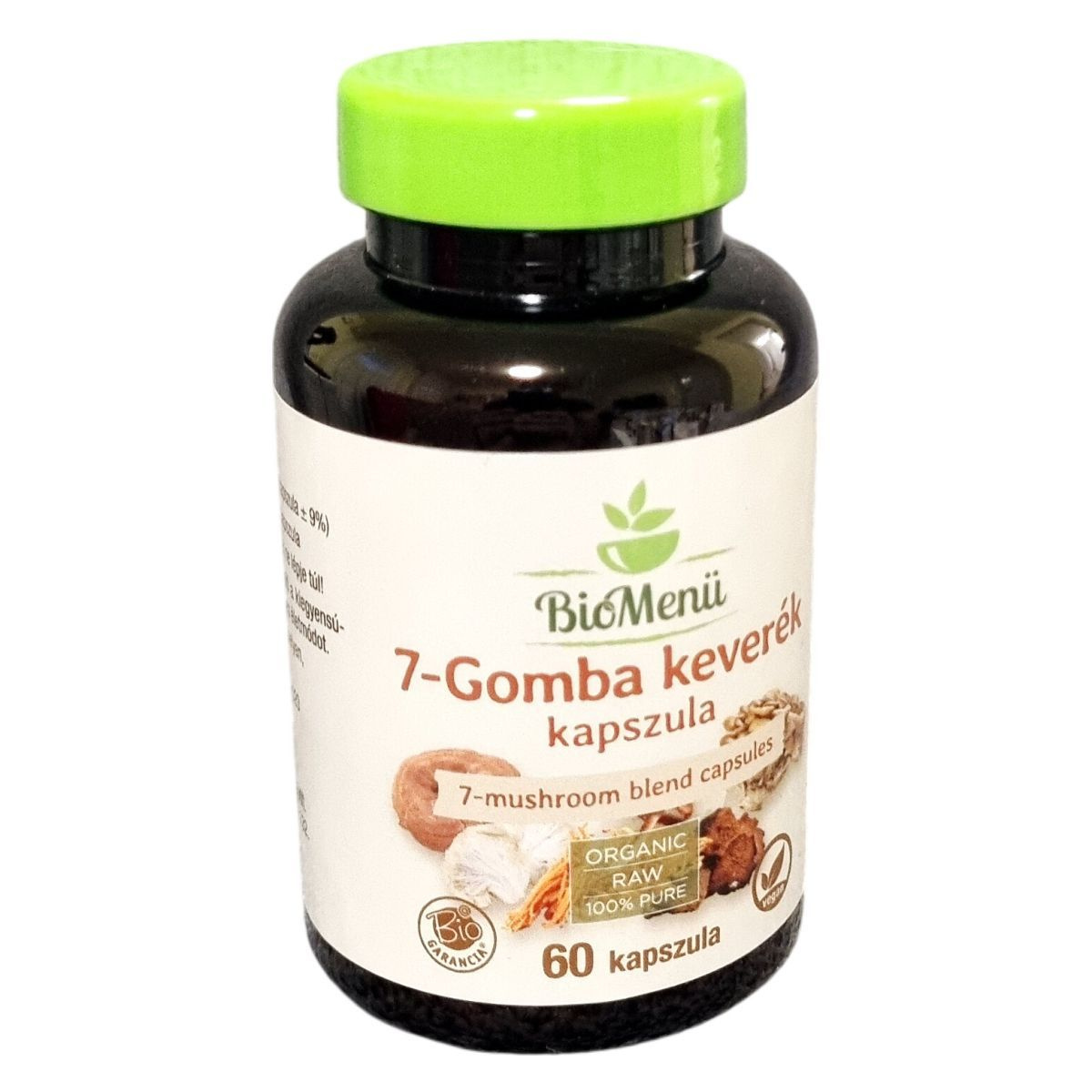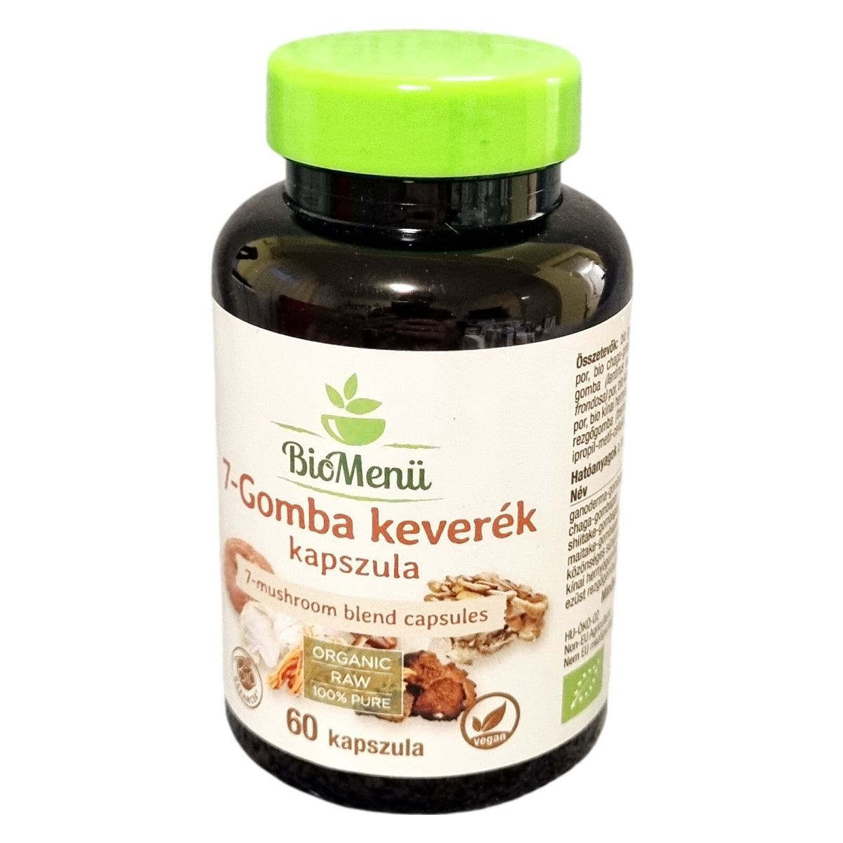 A BioMenü 7-Gomba keverék kapszula 60 darab 600 mg-os kapszulát tartalmaz. A termék származási helye Kína, a gombák biológiai minősítéssel (HU-ÖKO-02) rendelkeznek, és nem EU mezőgazdaságból származnak. A kapszulahéj hidroxpropil-metil-cellulózból készül, ami megfelel a vegán étrendnek. A termék organikus és nyers minősítésű, 100%-ban tiszta gombaporokat tartalmaz, amelyek számos fajta gombát foglalnak magukban, mint a ganoderma lucidum, inonotus obliquus, lentinus edodes, grifola frondosa, hericium erinaceus, cordyceps sinensis és tremella fuciformis. A kapszula napi adagja, azaz 2 kapszula, egyformán tartalmaz mind a hét gombafaj porát, mindegyiket 137,14 mg mennyiségben. A termék a természetesség és a minőség garanciájával bír, valamint minden kapszula vegán barát. Az ajánlott mennyiség betartása javasolt, és a termék nem helyettesíti az egészséges életmódot és a kiegyensúlyozott étrendet.