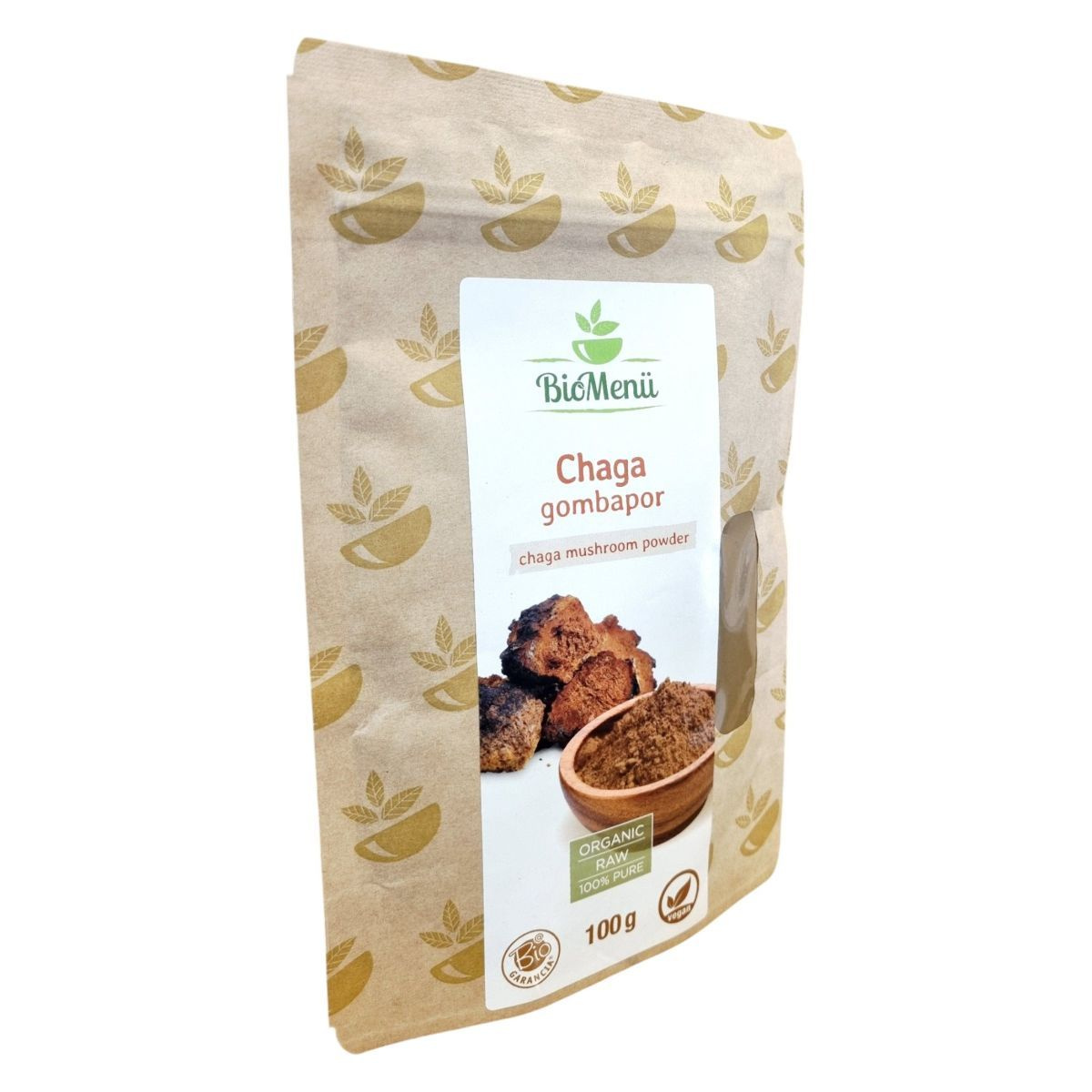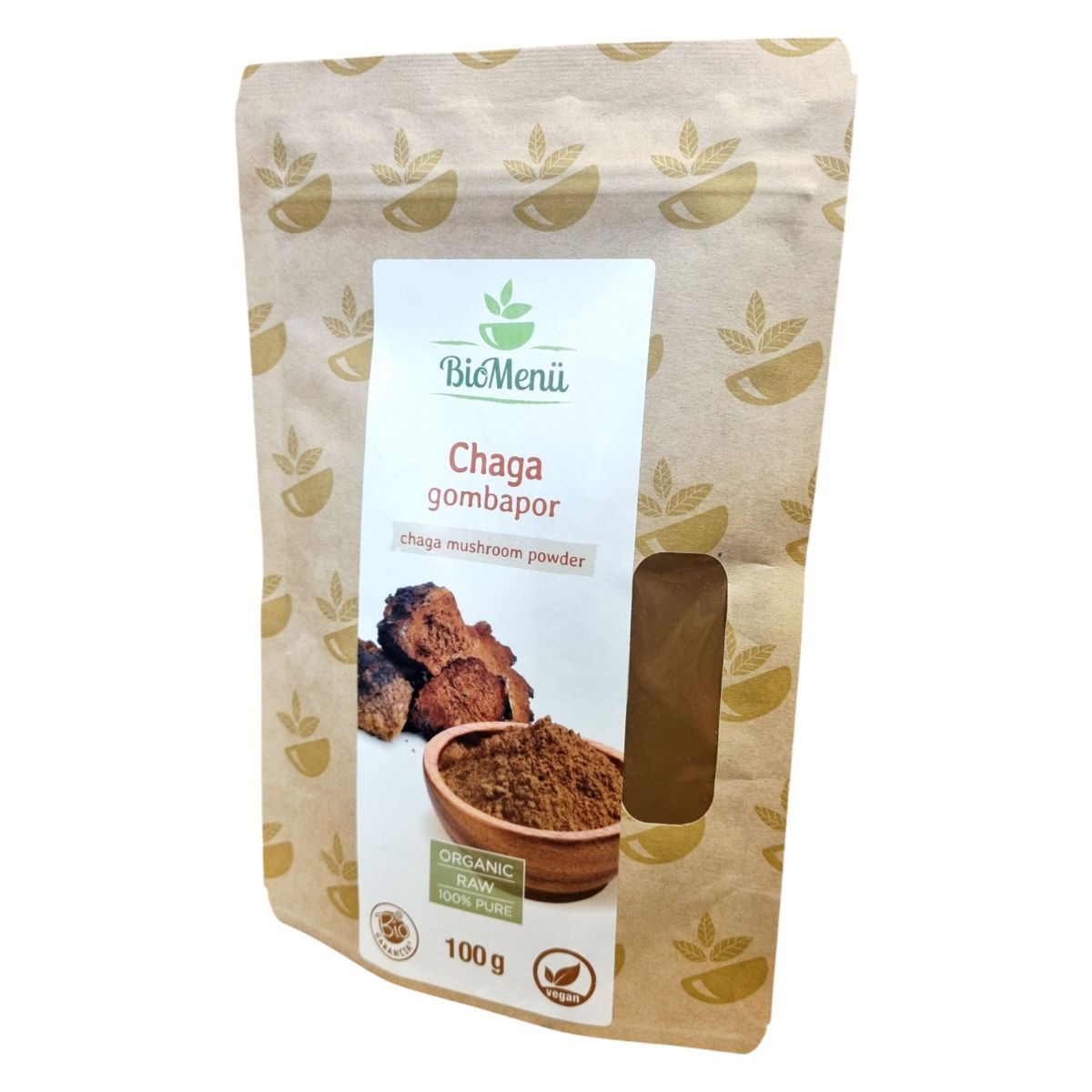 A BioMenü BIO CHAGA gombapor 100% tiszta, bio minőségű chaga gombából készül, amelyet Kínában termesztenek. A termék különösen gazdag rostokban, és alacsony zsír- és cukortartalmú. A chaga gomba antioxidáns hatású lehet, és támogathatja az immunrendszer működését. A termék megfelel a bio, raw és vegán étrendi irányzatoknak, és a HU-ÖKO-02 tanúsítvánnyal rendelkezik. A termék forgalmazója a Caleido IT-Outsource Kft., amely Budapesten található.