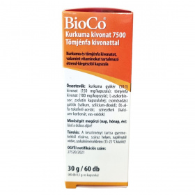 A BioCo Kurkuma kivonat 7500 Tömjénfa kivonattal kapszula egy magyar fejlesztésű és gyártású étrend-kiegészítő, mely kurkuma és tömjénfa kivonatot, valamint C- és E-vitaminokat tartalmaz. A termék 50-szeres koncentrációjú kurkuma kivonatot alkalmaz, amely 1 kapszulában 7,5 g kurkuma őrleménynek felel meg. A tömjénfa kivonat gazdag boswellin savban, amely az értékes hatóanyagok közé tartozik. A készítmény használatával az ízületek rugalmassága és komfortérzete hozzájárulhat az optimális egészség fenntartásához. A termék előállítása során kizárólag Magyarországon történik a gyártás és fejlesztés, bár a hatóanyagok nem Magyarországról származnak. A termék nem helyettesíti a kiegyensúlyozott étrendet és az egészséges életmódot, és bizonyos egészségügyi állapotok esetén, például epekövesség vagy véralvadási problémák esetén nem javasolt a használata. A kapszula gyártása az ISO 22000 és GMP előírásai szerint történik, garantálva a biztonságos és magas minőségű előállítást.