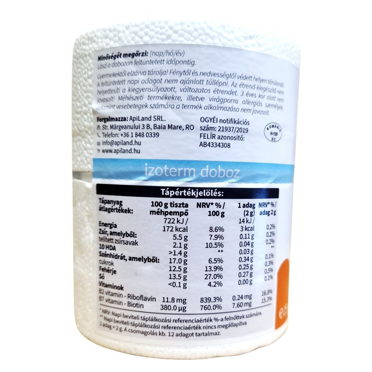 Az ApiLand® Tiszta Méhpempő egy friss étrend-kiegészítő, amely tiszta méhpempőt tartalmaz. A termék riboflavin és biotin tartalma hozzájárulhat a sejtek oxidatív stresszel szembeni védelméhez, a fáradtság csökkentéséhez, valamint a bőr és a haj normál állapotának fenntartásához. A termék használata minimum 6 hetes kúrákban javasolt, különösen tavasszal és ősszel, de egész évben fogyasztható. A méhpempő tiszta formában vagy mézben elkeverve is fogyasztható, különböző adagolásban gyermekek és felnőttek számára. A termék EU-ból származik, és az OGYÉI által notifikált. Tárolása hűtőszekrényben vagy szobahőmérsékleten, fénytől és nedvességtől védett helyen ajánlott.