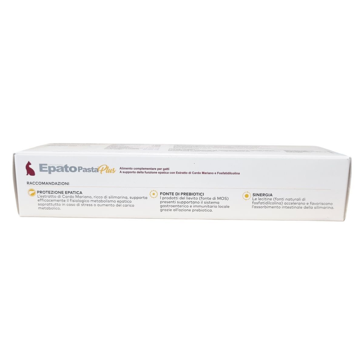 Az ORIGINAL EpatoPastaPlus egy takarmánykiegészítő macskák számára, mely elősegítheti a májműködést. Hatóanyagai között található szilimarinban gazdag őszbogáncs kivonat, amely különösen stressz vagy metabolikus terhelés esetén támogathatja a máj normál anyagcseréjét. Az élesztőtermékek (MOS) prebiotikus hatását kihasználva segíthetik a gyomor-bélrendszer, valamint a helyi immunrendszer működését. A lecitinek, amelyek természetes foszfatidil-kolin források, elősegíthetik a szilimarin hatékonyabb felszívódását a bélből. A termék kizárólag szájon át alkalmazható, javasolt legalább 20-30 napos használata, ami szükség esetén meghosszabbítható. A készítményt hűvös, száraz helyen kell tartani. A termék Olaszországban készült, környezetbarát csomagolásban, amely a szakszerű hulladékgyűjtési előírásokat betartva kezelendő.