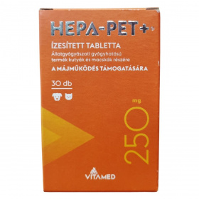 A Hepa-Pet+ ízesített tabletta állatgyógyászati készítmény különösen kutyák és macskák számára. A termék egy tablettájában több hatóanyag található, melyek májműködés támogatására szolgálnak. Ezek között szerepel az S-Adenozil-L-metionin (SAMe), a máriatövis termés kivonat, valamint B6-, B12- és E-vitaminok. A tablettákat általában a kistestű kutyáknak és macskáknak napi egy darabban ajánlják, nagyobb kutyáknak pedig több darabban, testsúlytól függően. Sebészeti beavatkozás esetén a műtét előtti 7. naptól a varratszedésig naponta adható, hosszú távú használatnál 1-2 hónapig naponta, majd kétnaponta adagolható. A tablettát etetés előtt legalább egy órával javasolt beadni, és ízesített volta miatt a legtöbb állat szívesen elfogyasztja. A termék kizárólag állatok részére készült, gyermekek elől elzárandó, és száraz, hűvös helyen célszerű tárolni.
