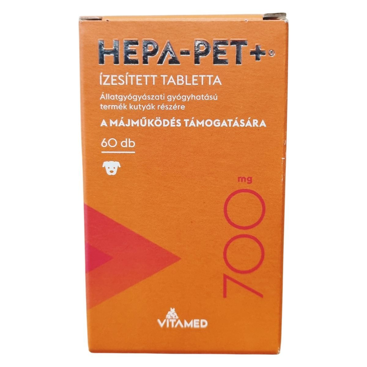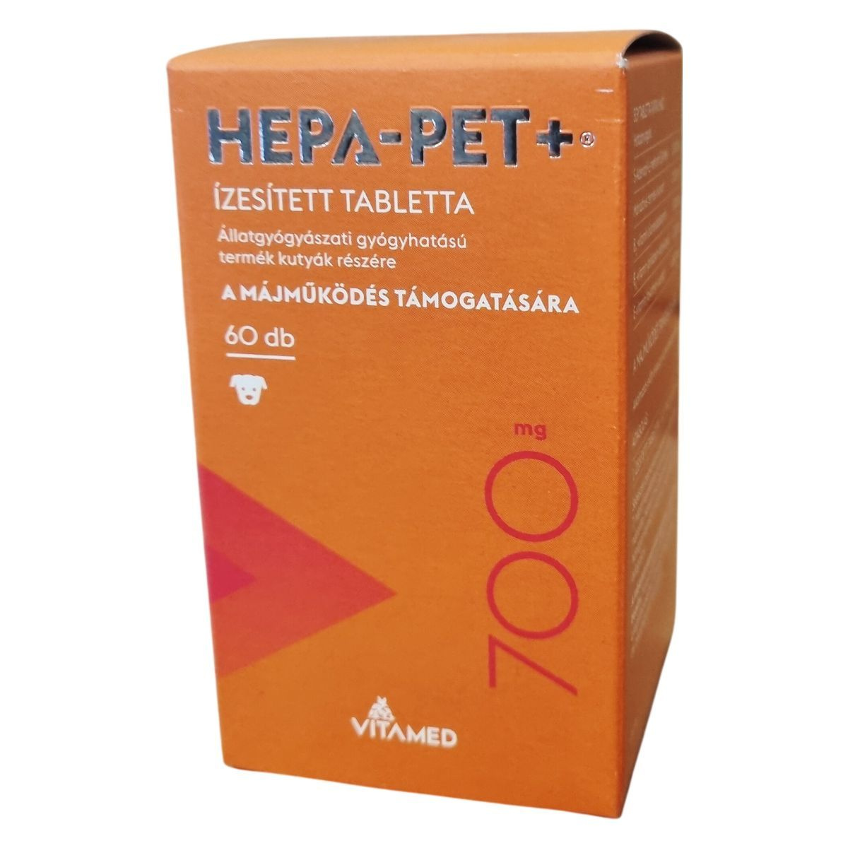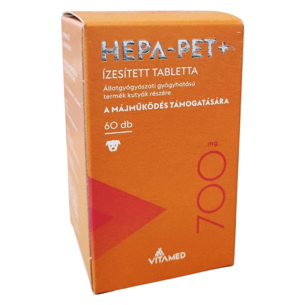 A HEPA-PET+® ízesített tabletta állatgyógyászati gyógyhatású termék kutyák számára, mely a májműködés támogatására készült. Egy tabletta 700 mg-os, és tartalmaz olyan hatóanyagokat, mint a S-Adenozil-L-metionin (SAMe), máriatövis termés kivonat, továbbá B-vitaminokat és E-vitamint. A terméket főként a műtéti beavatkozás előtti napoktól a varratszedésig, illetve hosszú távon is javasolhatják. A tabletták ízesítettek, ezért az állatok általában szívesen elfogyasztják, de szükség esetén kis falatban is beadható. A termék kizárólag állategészségügyi vagy állatápolási célra szolgál, gyermekektől elzárva kell tartani. A dobozon fel van tüntetve a gyártási szám és egyéb fontos információk.