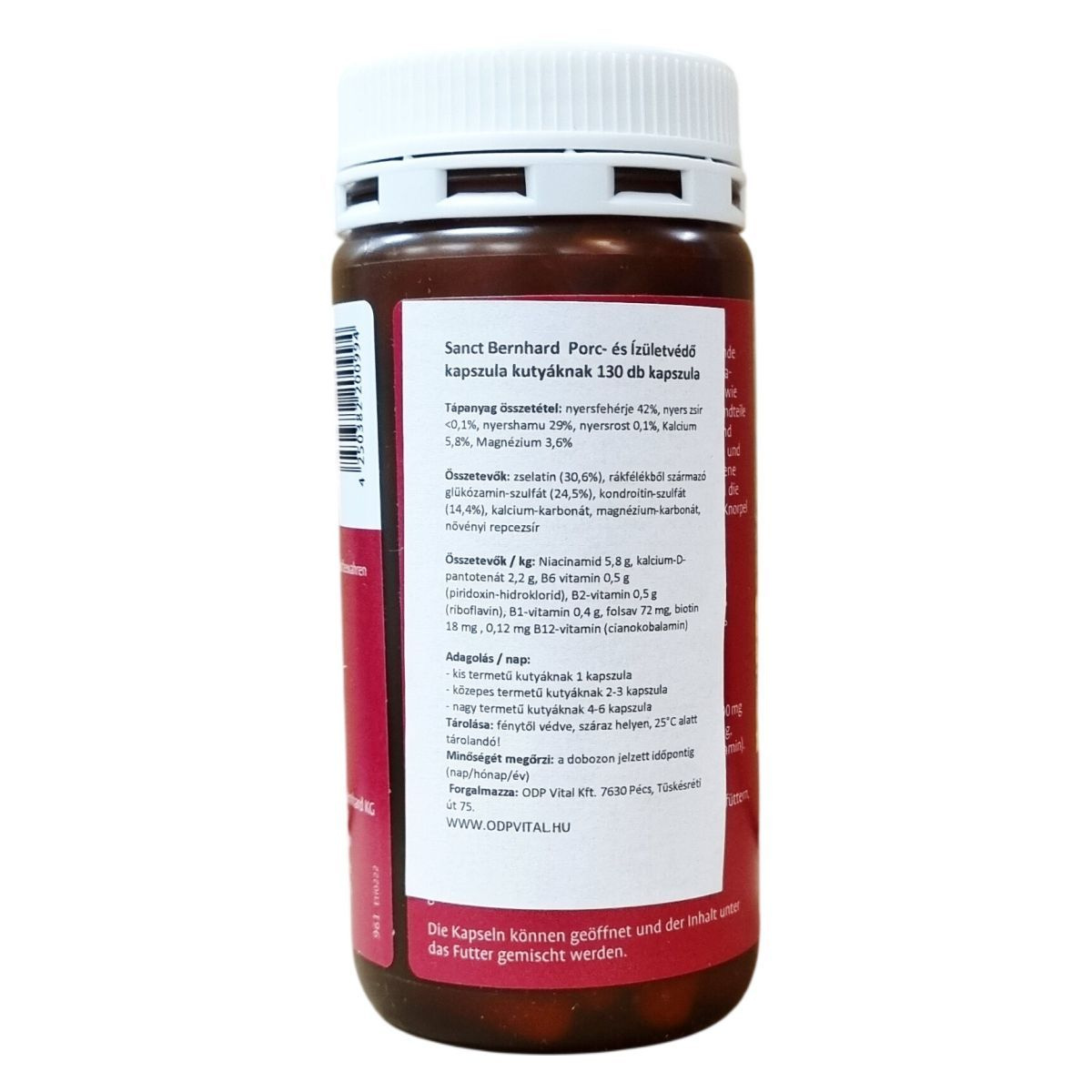 A Sanct Bernhard Porc- és Ízületvédő kapszula kutyáknak készült, hogy támogassa az ízületek egészségét. A termék glükozamin-szulfátot és kondroitin-szulfátot tartalmaz, amelyek hozzájárulhatnak az ízületek rugalmasságához és egészségéhez. A kapszulák továbbá fontos vitaminokat és ásványi anyagokat is tartalmaznak, mint például niacinamid, kálcium-D-pantotenát, B-vitaminok, folsav és biotin. A termék használata különösen ajánlott azoknak a kutyáknak, akiknek ízületi problémáik lehetnek. A kapszulákat könnyű adagolni, és különböző méretű kutyák számára is megfelelő adagolási útmutatót biztosítanak.