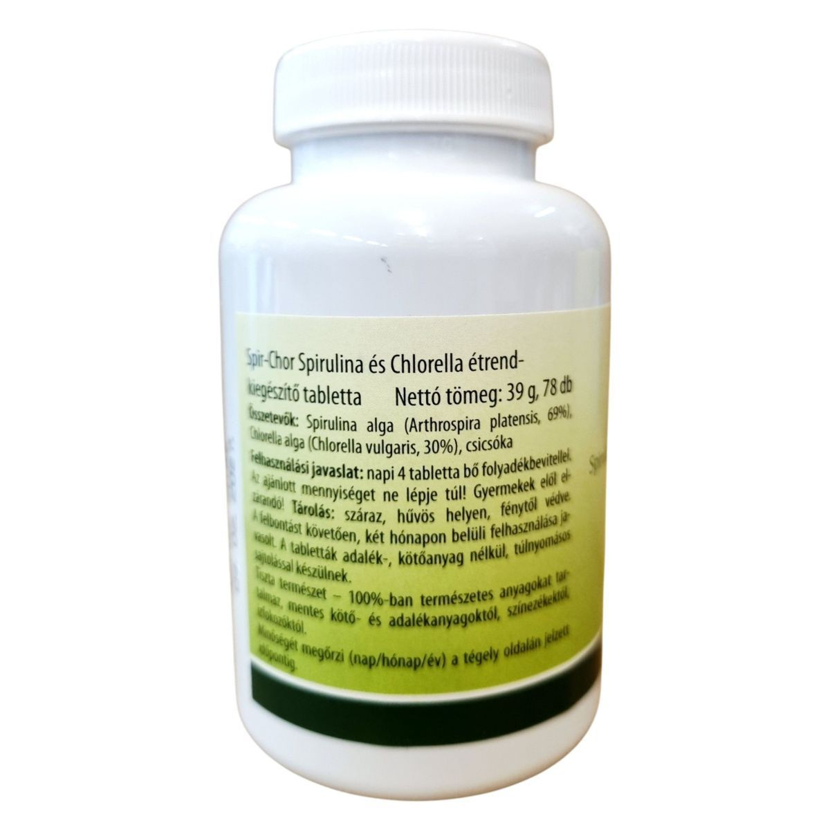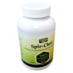A Spir-Chor tabletta spirulina és chlorella mikroalgák természetes kombinációja, amelyek gazdagok fehérjében, klorofillban, vitaminokban és ásványi anyagokban. A spirulina és chlorella algák hozzájárulhatnak a szervezet méregtelenítő folyamataihoz, a sejtek védelméhez és a vitalitás fenntartásához. Rendszeres fogyasztása támogathatja az immunrendszert és az energiaszint megőrzését, különösen stresszes életmód vagy fokozott igénybevétel esetén. A készítmény teljes mértékben természetes összetevőkből készül, adalékanyagok, kötőanyagok és színezékek nélkül. Származási helye az Európai Unió, előállítása ellenőrzött növényi alapanyagokból történik, a Zöldvér program részeként.