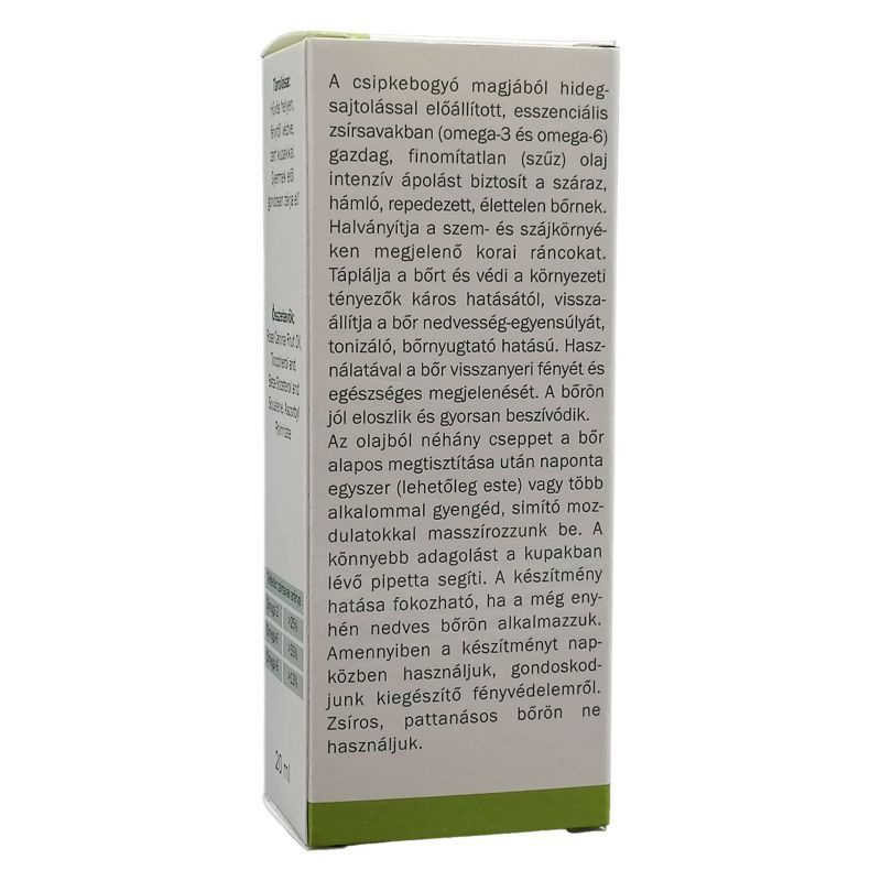 A csipkebogyó magjából hidegsajtolással előállított, finomítatlan olaj intenzív ápolást biztosít a száraz, élettelen bőrnek.
