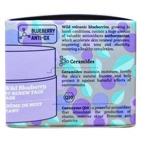A vad vulkáni áfonya kivonat bőséges antioxidánsokat tartalmaz, amelyek felgyorsítják a bőr megújulását, javítják a tónust és a rugalmasságot, helyreállítva az egészséges arcbőrt. A ceramidok fenntartják a bőr nedvességtartalmát, erősítik természetes védőrétegét, míg a koenzim Q10 növeli a bőr feszességét és rugalmasságát. A termék vegán és kizárólag természetes alapanyagokat használ, beleértve organikus és vadon gyűjtött növényi kivonatokat. Használatával az éjszaka folyamán az arcbőr megújul, reggelre simább és ragyogóbb lesz.