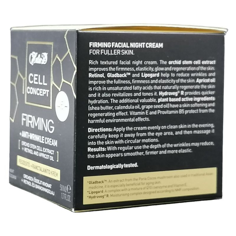Gazdag textúrájú feszesítő éjszakai arckrém teltebb arcbőrért. Az orchidea őssejt kivonat javítja a bőr feszességét, rugalmasságát, ragyogását és támogatja a regenerálódását. A retinol, a Gladback™ és a Lipogard hozzájárulhatnak a ráncok csökkentéséhez és a bőr teltségének, feszességének javításához. A barackmagolaj telítetlen zsírsavakban gazdag, természetes módon regenerálja a bőrt, revitalizáló és tónizáló hatású. A Hydrovég® R gyors hidratáló hatást biztosít. A további növényi hatóanyagok – shea vaj, körömvirág-olaj és szőlőmag-olaj – bőrpuhító és bőrregeneráló hatásúak. Az E-vitamin és a B5 provitamin védelmet nyújtanak a káros környezeti hatásokkal szemben. Rendszeres használat mellett a ráncok mélysége csökkenhet, a bőr simábbnak, feszesebbnek és rugalmasabbnak látszik. Dermatológiailag tesztelt. Made in Hungary.