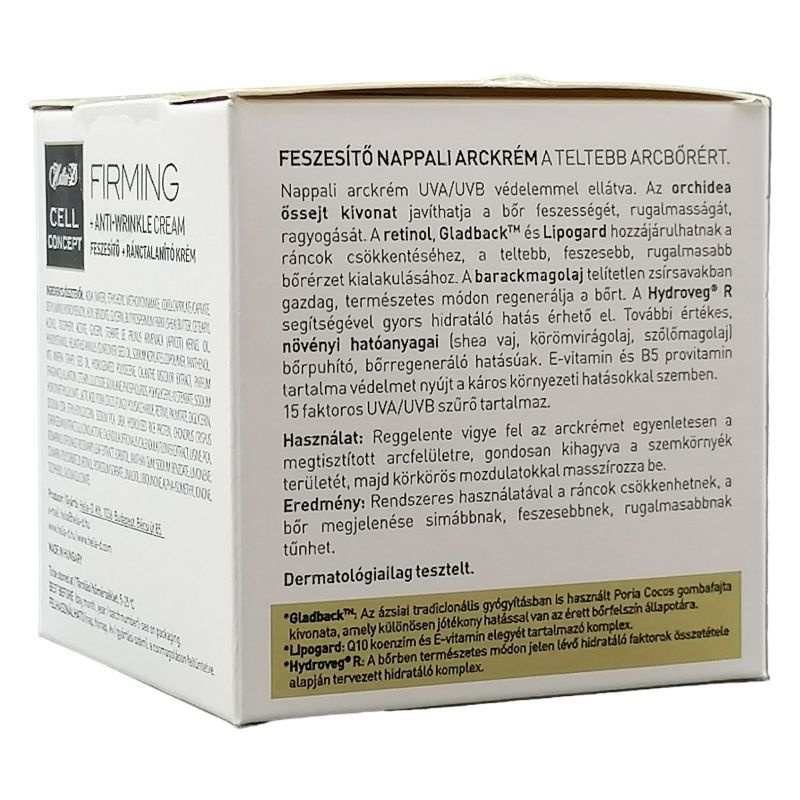 Feszesítő nappali arckrém teltebb arcbőrért, UVA/UVB védelemmel (SPF 15). Az orchidea őssejt kivonat javíthatja a bőr feszességét, rugalmasságát és ragyogását. A retinol, a Gladback™ és a Lipogard® hozzájárulhatnak a ráncok csökkentéséhez és a bőr teltségének, feszességének javításához. A barackmagolaj telítetlen zsírsavakban gazdag, természetes módon segíti a bőr regenerálódását. A Hydrovég® R gyors hidratáló hatást biztosít. A további növényi hatóanyagok (shea vaj, körömvirág olaj, szőlőmagolaj) bőrpuhító és bőrregeneráló hatásúak. Az E-vitamin és a B5 provitamin védelmet nyújtanak a káros környezeti hatásokkal szemben. Rendszeres használat mellett a ráncok mélysége csökkenhet, a bőr simábbnak, feszesebbnek és rugalmasabbnak tűnhet. Dermatológiailag tesztelt. Made in Hungary.