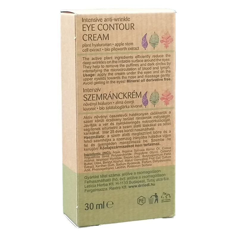 A növényi összetevők hatékonyan csökkentik a szem körüli érzékeny terület ráncainak mélységét. Javítják a vér és nyirokkeringés mikro cirkulációját, segítenek eltüntetni a szem alatti táskákat és sötét karikákat. Kőolajszármazékot és mesterséges színezéket nem tartalmaz.