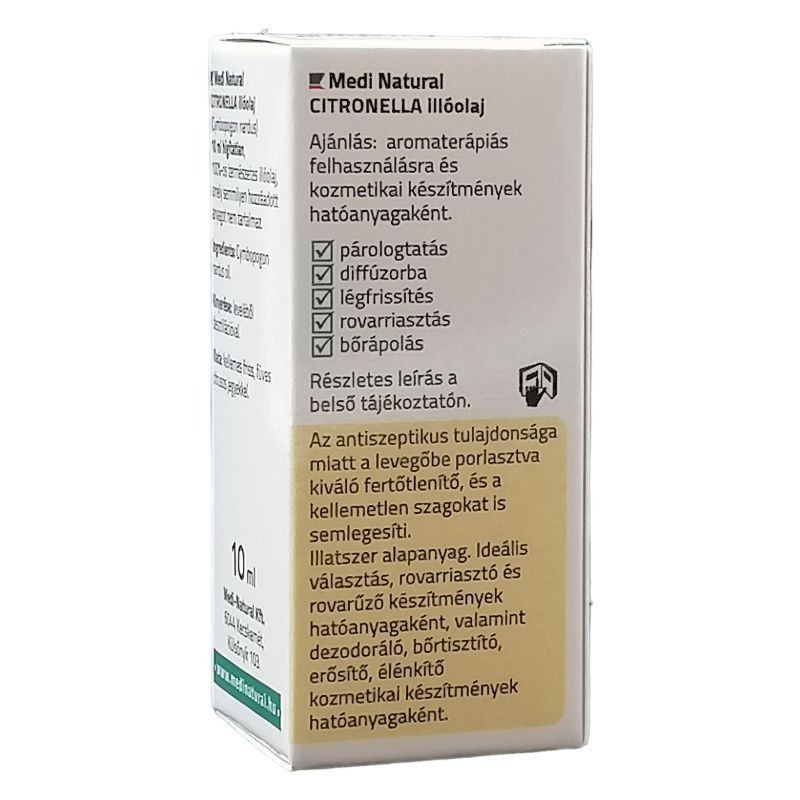 A Medinatural Citronella illóolaj ideális választás, rovarriasztó és rovarűző készítmények hatóanyagaként valamint dezodoráló, bőrtisztító, erősítő, élénkítő kozmetikai készítmények hatóanyagaként. Az antiszeptikus tulajdonsága miatt a levegőbe porlasztva kiváló fertőtlenítő és a kellemetlen szagokat is semlegesíti.