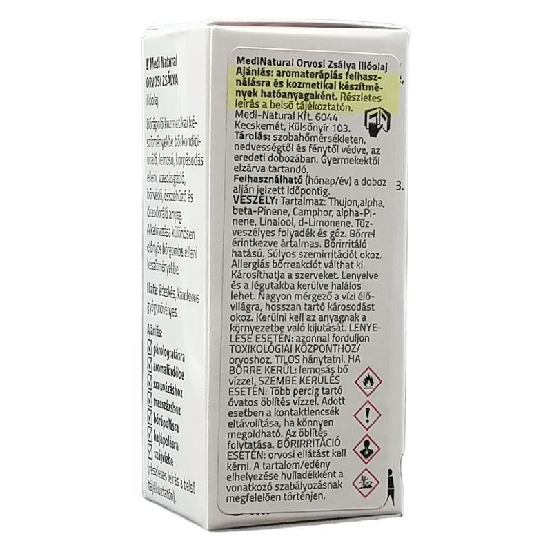 100%-os orvosi zsálya illóolaj (Salvia Officinalis Oil). Hígítatlan, természetes összetételű, hozzáadott anyagokat nem tartalmaz.