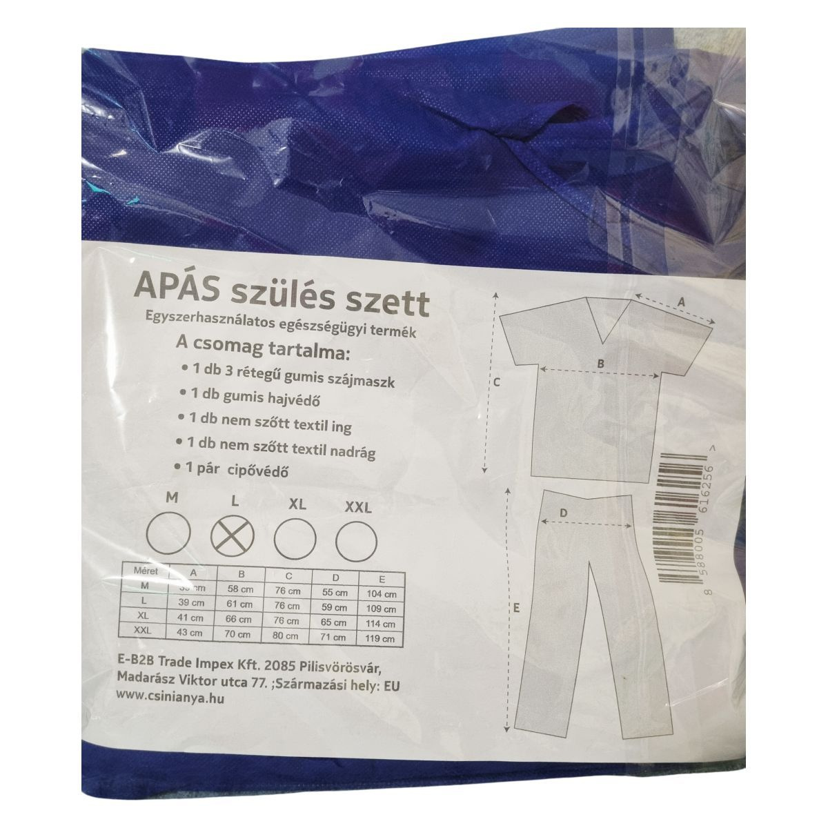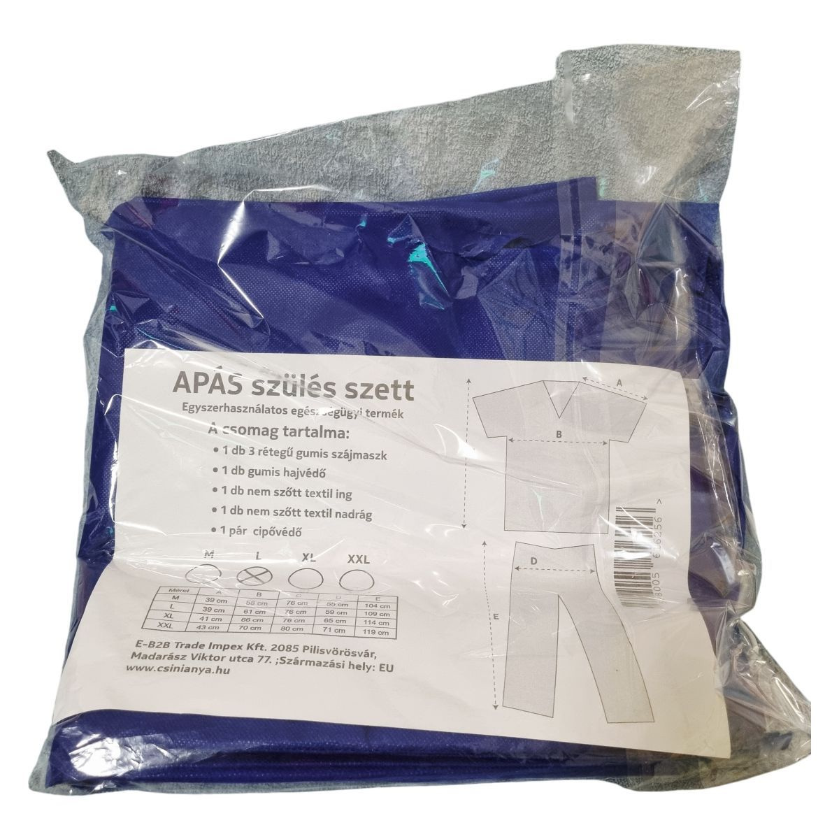 Édesapáknak készült szett olyan egyszer használatos ruházati elemeket tartalmaz, amelyek segíthetnek a higiénés követelmények betartásában és a szülőszobai jelenléthez szükséges alapvető védelmet biztosítani.