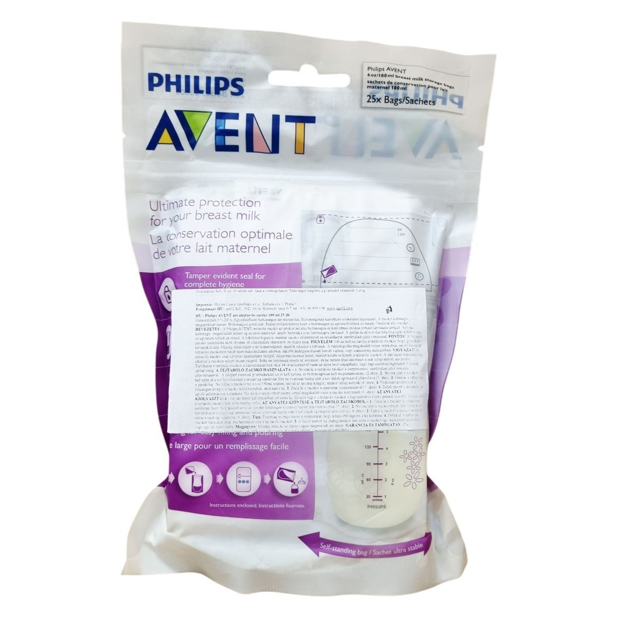 Elősterilizált anyatejtároló zacskók 180 ml űrtartalommal, 25 darabos kiszerelésben. Kétrétegű kialakítás, megerősített perem és erős simítózár biztosítja a szivárgásmentes és higiénikus tárolást. Széles nyílásának köszönhetően könnyen tölthető és önthető. Sterilizálást jelző tömítéssel ellátott, önállóan megálló tasak. Származási hely: Kína. Minőségét megőrzi a gyártástól számított 3 évig. További információ: www.philips.com.