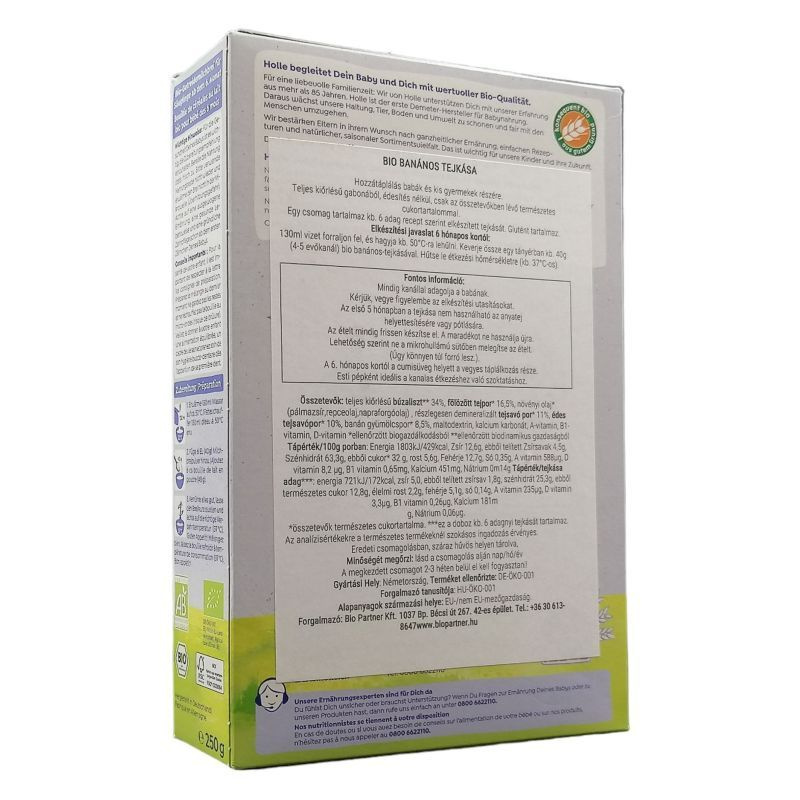 Holle bébiétel, banános tejkása. Könnyen emészthető kása kifejezetten csecsemőknek. Bio, cukrot nem tartalmazó termék. Glutén tartalmú. Főzés nélkül, csak víz felhasználásával egyszerűen elkészíthető.