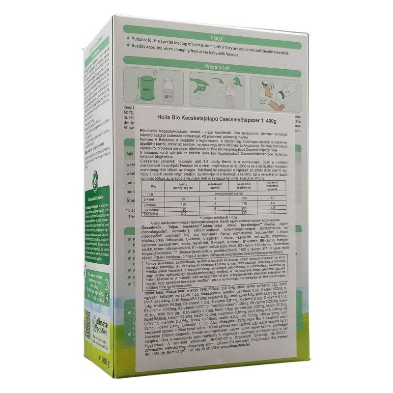 Ellenőrzött biogazdálkodásból származó, instant, vízzel készíthető kecsketej alapú csecsemőtápszer. Különleges táplálék a babáknak, már az újszülött kortól adható. Hozzáadott cukrot nem tartalmaz, csak természetes cukrot. Összetevőinek 99%-a ökológiai gazdálkodásból származik. A benne található bio növényi olajok fontos zsírsav források. Gluténmentes és tojásmentes termék.
