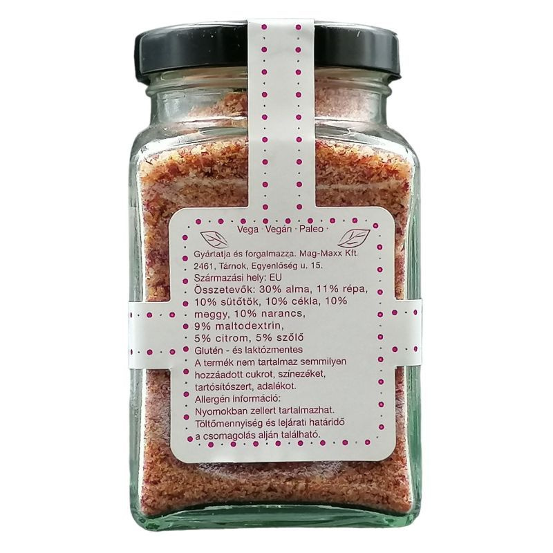 30% alma, 11% répa, 10% sütőtök, 10% cékla, 10% meggy, 10% narancs, 9% maltodextrin, 5% citrom, 5% szőlő