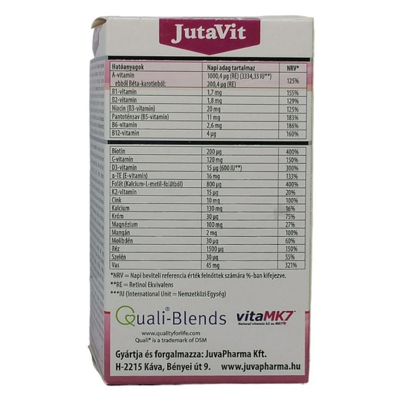 Terhességet megelőzően, terhesség és szoptatási időszak alatt. A JutaVit terhességi vitamin hozzájárul a terhesség és szoptatási időszak alatti időszak folyamán megnövekedett vitamin és ásványi anyag szükséglet kielégítéséhez. A várandós anyák tápanyagszükséglete megváltozik. Kiemelt figyelmet érdemel a megfelelő folát-folsav-bevitel. A termékben a folsav 100%-ban metafolin.