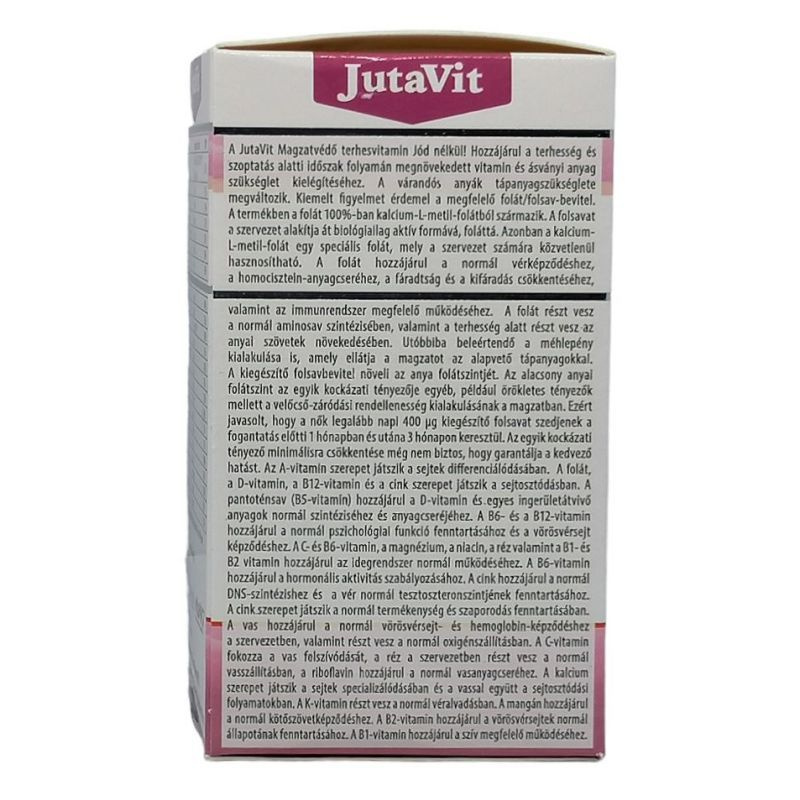 A JutaVit magzatvédő terhesvitamin vitaminokat, ásványi anyagokat tartalmazó komplex összetételű étrend-kiegészítő készítmény Metafolin-ból származó 800μg folsavval.