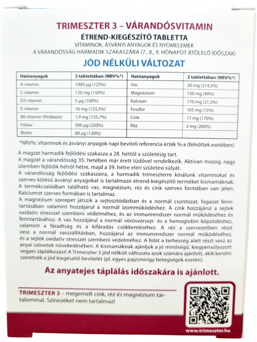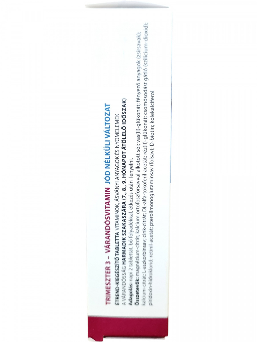 A Trimeszter 3 jódmentes várandósvitamin a terhesség utolsó trimeszterére (7–9. hónap) készült. Megemelt cink-, réz- és magnéziumtartalmával segíthet a kismama és a magzat igényeinek kielégítésében. A készítmény hozzájárulhat az immunrendszer, a csontozat és az izmok normál működéséhez, valamint a fáradtság és kifáradás csökkentéséhez. A folsav támogatja a normál vérképződést és a sejtosztódást, a vas és a réz pedig a normál vörösvérsejt- és hemoglobinképződést. A termék szabadalmaztatott formula, allergén- és színezékmentes, így kifejezetten biztonságos választás a várandósság harmadik szakaszára, valamint az anyatejes táplálás időszakára is ajánlott.