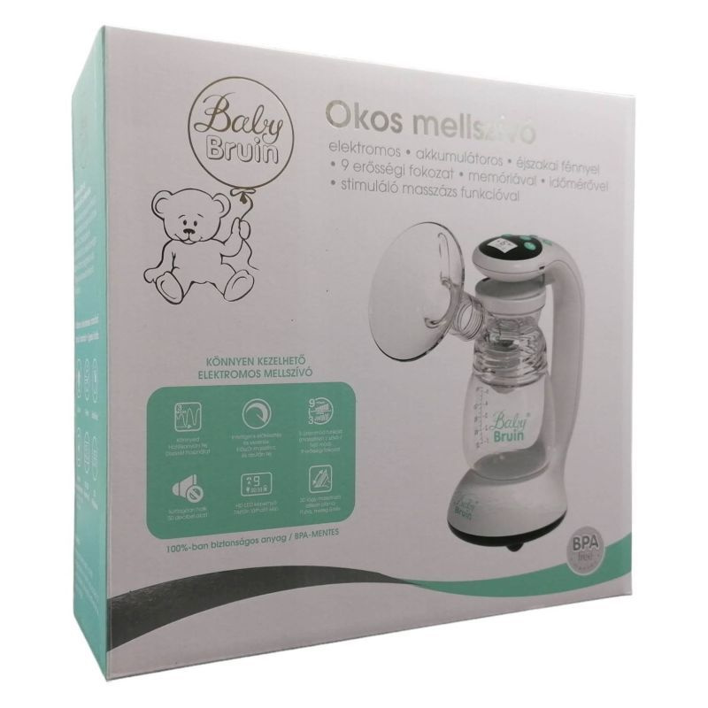 BabyBruin okos elektromos mellszívó, BPA mentes széles szájú cumisüveggel, érintőképernyős kijelzővel, beépített, újratölthető akkumulátorral, 9 erősségi fokozattal.