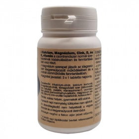 Hogyan kell alkalmazni a készítményt? 3-10 éves kor között 1-2 x 1 tabletta, 10 éves kor felett, terhesség és szoptatás alatt, csonttörés vagy csontritkulás esetén 2-3 x 1 tabletta étkezés közbeni bevétele javasolt a szedést indokoló állapot /betegség idejéig. Mikor nem ajánlott alkalmazása? A készítmény összetevőivel szembeni túlérzékenység, vesebetegség, vesekő-képződési hajlam esetén. Alkalmazható-e terhesség vagy szoptatás idején? A terhesség és szoptatás ideje alatt megnő a szervezet ásványianyag-igénye, ezért ezen élethelyzetekben javasolt a készítmény szedése. Lehetséges mellékhatások: A készítmény összetevőivel szembeni túlérzékenység, illetve az arra hajlamos egyéneknél ritkán előfordulhat vesekőképződés. Mire kell még ügyelnie? Orális tetraciklinek, fluorokinolon, fenitoin és biszfoszfonát és a készítmény bevétele között legalább 3 óra teljen el! Együtt adása kerülendő tiazid-típusú vizelethajtóval és Digitalis-glikozidokkal. Gyermekektől elzárva tartandó! Csomagolási egység: 90 db. Hogyan kell tárolni a készítményt? Szobahőmérsékleten (25 °C-on) tartandó!