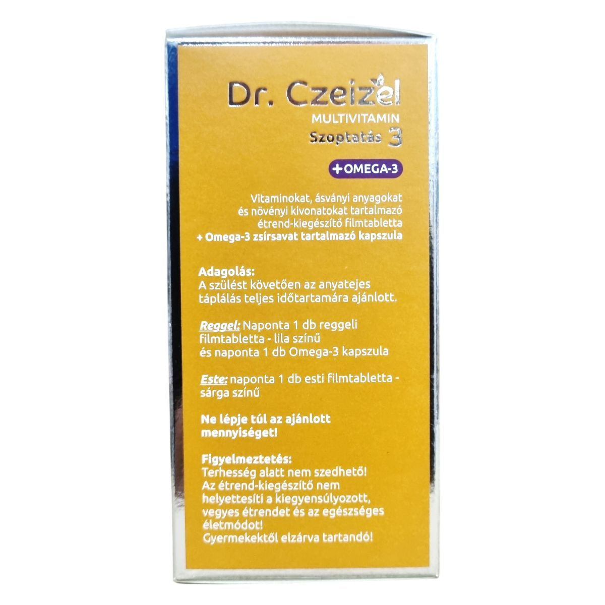 A Dr. Czeizel MULTIVITAMIN Szoptatás 3 +OMEGA-3 egy komplex étrend-kiegészítő, amely vitaminokat, ásványi anyagokat és növényi kivonatokat tartalmaz filmtabletta formában, továbbá Omega-3 zsírsavat kapszulában. A termék aktív folát tartalommal és szerves vasforrással rendelkezik, valamint mellőzi a laktózt, glutént és a cukrot. A reggeli filmtablettába folsav, D-vitamin és B6-vitamin tartozik, melyek hozzájárulhatnak a normál vérképződéshez, a sejtosztódáshoz, az immunrendszer működéséhez, valamint a fáradtság csökkentéséhez. Az esti filmtabletta jódot és vasat tartalmaz, amelyek támogathatják az idegrendszer és a pajzsmirigy egészséges működését. Az Omega-3 kapszula halolajat tartalmaz, amely az anyai DHA bevitelével hozzájárulhat a magzat és a szoptatott csecsemő agyának és szemének fejlődéséhez. A termék használata szoptatás alatt ajánlott, a szülést követően a teljes anyatejes táplálási időszakra. A termék nem helyettesíti a változatos étrendet és egészséges életmódot, valamint terhesség alatt nem szedhető. Kongruens csomagolása 30-30 reggeli és esti filmtablettát, valamint 30 db Omega-3 kapszulát tartalmaz.