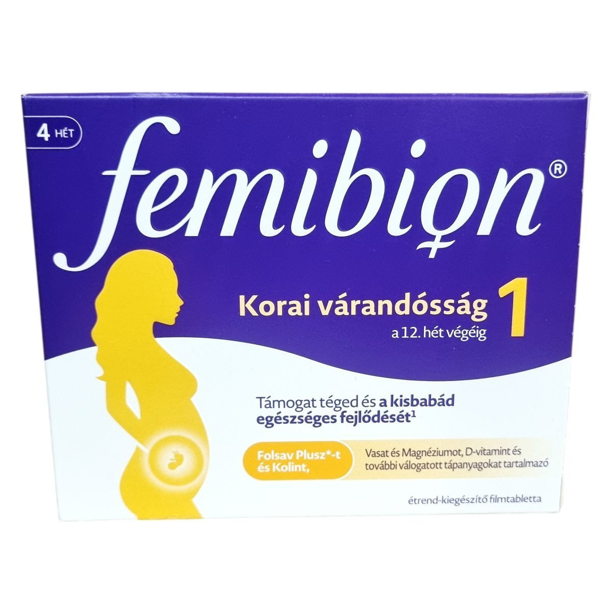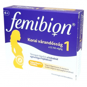 A Femibion® Korai várandósság 1 egy olyan étrend-kiegészítő filmtabletta, amely elsősorban az első trimeszter végéig támogatja az anyát és a magzat egészséges fejlődését. A termék alapja a Folsav Plusz, amely a folsav és L-metilfolát kombinációja, és segítheti a folátszint növelését a szervezetben, amely fontos a velőcsőzáródási rendellenességek kockázatának csökkentésében. Továbbá tartalmaz kolin-bitartrátot, amely hozzájárulhat a normál homocisztein-anyagcseréhez, valamint fontos ásványi anyagokat, mint a vas, magnézium, cink, réz, jód és szelén. Ezek az ásványi anyagok szerepet játszanak a sejtosztódásban, az immunrendszer és az anyai szervezet támogatásában, továbbá segíthetik a fáradtság és kifáradás csökkentését. A termék szigorúan glutén- és laktózmentes, és gyermekek elől elzárva tartandó. Az étrend-kiegészítő nem helyettesíti a kiegyensúlyozott, vegyes étrendet és az egészséges életmódot, ezért használata előtt ajánlott orvosi vagy gyógyszerészi tanácsot kérni, különösen más készítmények szedése esetén.
