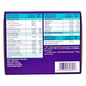Használati utasítás: Vegyen be naponta egy filmtablettát és egy lágy kapszulát elegendő mennyiségű vízzel, lehetőleg étkezés közben. Az ajánlott napi mennyiséget ne lépje túl! Az étrend-kiegészítő nem helyettesíti a kiegyensúlyozott, vegyes étrendet és az egészséges életmódot. Az A-vitamin tartalma miatt a termék nem szedhető a terhesség első trimeszterében. Ha teherbe kíván esni, várandós és/vagy bármilyen kérdése van vagy bizonytalan, mielőtt elkezdi szedni ezt az étrend-kiegészítőt, kérje kezelőorvosa vagy gyógyszerésze tanácsát, annak eldöntéséhez, hogy ez az étrend-kiegészítő megfelelő-e az Ön számára. Ez különösen fontos, ha ezt a terméket más étrend-kiegészítőkkel vagy gyógyszerekkel együtt szedi. Figyelmesen olvassa el az összetevőket, és ne szedje a terméket, ha ismerten érzékeny bármely összetevőre.