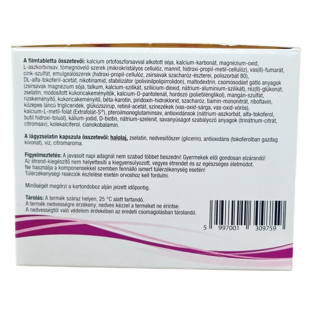 kalcium ortofoszforsavval alkotott sója, kalcium-karbonát, magnézium-oxid, L-aszkorbinsav, mikrokristályos cellulóz, mannit, hidroxi-propil-metil-cellulóz, vas(II)-fumárat, cink-szulfát, hidroxi-propil-cellulóz, zsírsavak szacharóz-észterei, poliszorbát 80, DL-alfa-tokoferil-acetát, nikotinamid, polivinilpolipirrolidon, maltodextrin, zsírsavak magnézium sója, talkum, kalcium-szilikát, szilícium-dioxid, nátrium-aluminium-szilikát, réz(II)-glukonát, zselatin, módosított kukoricakeményítők, kalcium-D-pantotenát, polietilénglikol, mangán-szulfát, rizskeményítő, kukoricakeményítő, béta-karotin, piridoxin-hidroklorid, szacharóz, tiamin-mononitrát, riboflavin, közepes láncú trigliceridek, glükózszirup, retinil-acetát, vas-oxid-sárga, vas-oxid-vörös, kalcium-L-metil-folát (Extrafolate-S®), pteroilmonoglutaminsav, nátrium-aszkorbát, alfa-tokoferol, butil hidroxi-toluol, kálium-jodid, D-biotin, nátrium-szelenit, trinátrium-citrát, citromsav, kolekalciferol, cianokobalamin, halolaj, glicerin, tokoeferolban gazdag kivonat, víz, citromaroma