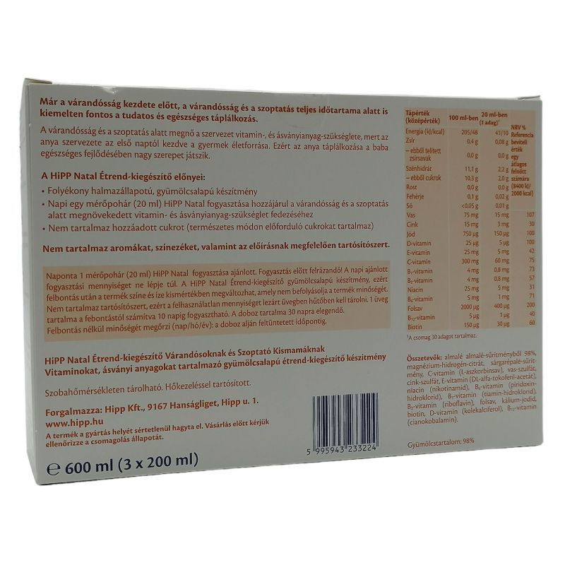 A kiegyensúlyozott, változatos táplálkozás mellett már a várandósság tervezésekor, a várandósság és a szoptatás teljes időtartama alatt a folyékony halmazállapotú HiPP Natal Étrend-kiegészítő rendszeres fogyasztása ajánlott, amely hozzájárul a megnövekedett vitamin- és ásványianyag-szükséglet fedezéséhez. A 3 x 200 ml kiszerelés 1 havi adagot tartalmaz. A vegetáriánius kismamáknak érdemes dietetikussal konzultálni a megfelelő táplálkozásról.