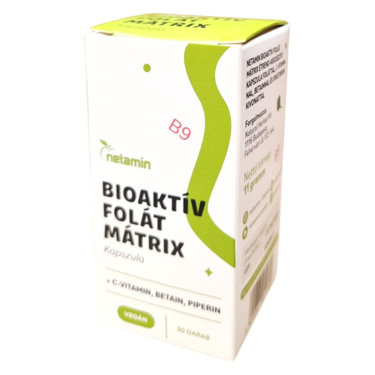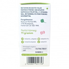 A Netamin Bioaktív Folát Mátrix kapszula egy vegán étrend-kiegészítő, amely folátot, C-vitamint, betaint és feketebors kivonatot tartalmazhat. A folát hozzájárulhat a normál vérképződéshez, a homocisztein-anyagcseréhez, a pszichológiai funkciók fenntartásához, és szerepet játszhat a sejtosztódásban. Terhesség alatt részt vehet az anyai szövetek növekedésében. A C-vitamin és a folát támogathatják az immunrendszer normál működését, valamint csökkenthetik a fáradtság és kifáradás érzését. A termék 30 kapszulát tartalmaz, és a Natural Herbal Kft. forgalmazza.