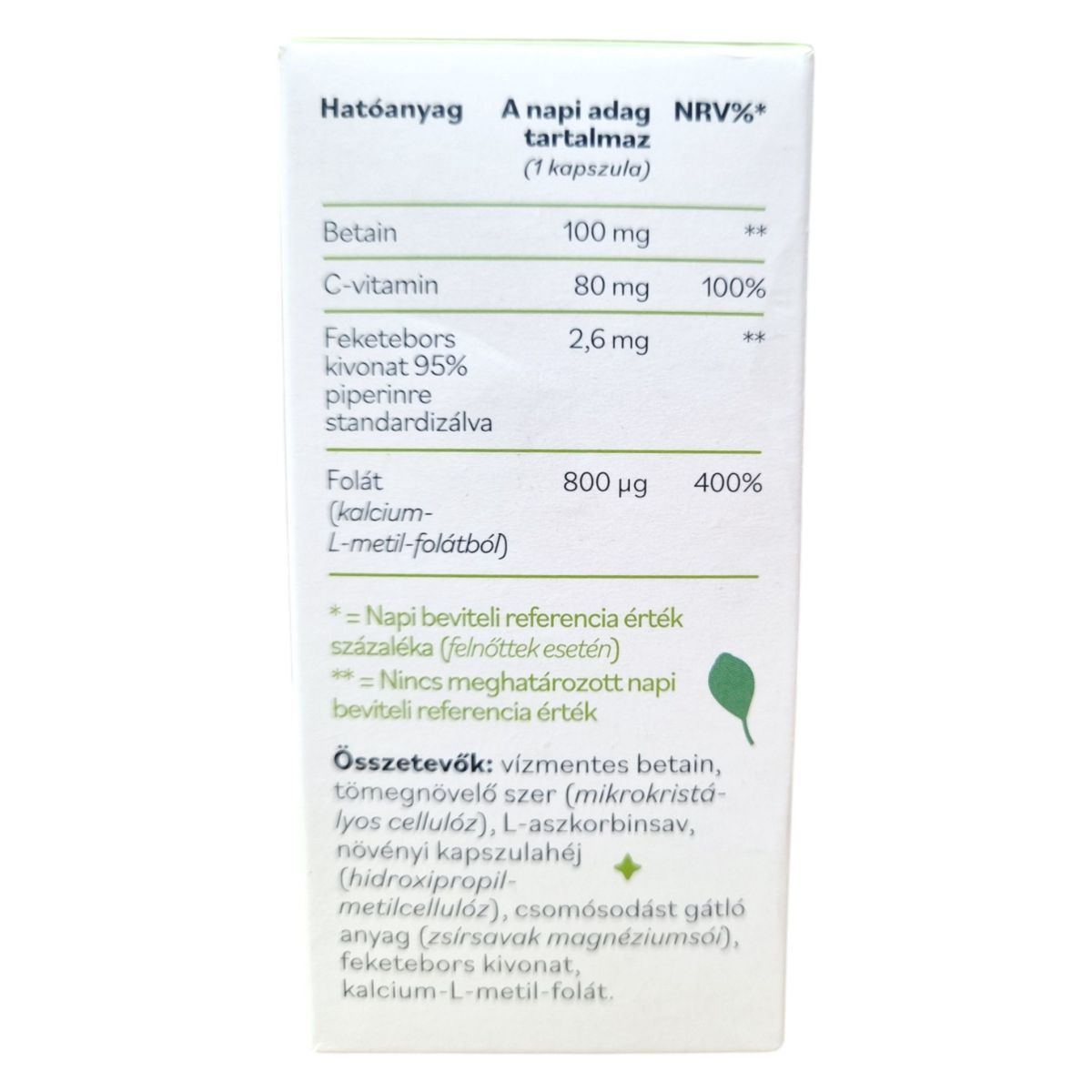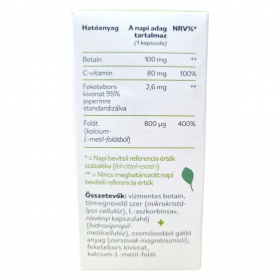 Vízmentes betain, tömegnövelő szer (mikrokristályos cellulóz), L-aszkorbinsav, növényi kapszulahéj (hidroxipropil-metilcellulóz), csomósodást gátló anyag (zsírsavak magnézium sói), feketebors kivonat, kalcium-L-metil-folát.