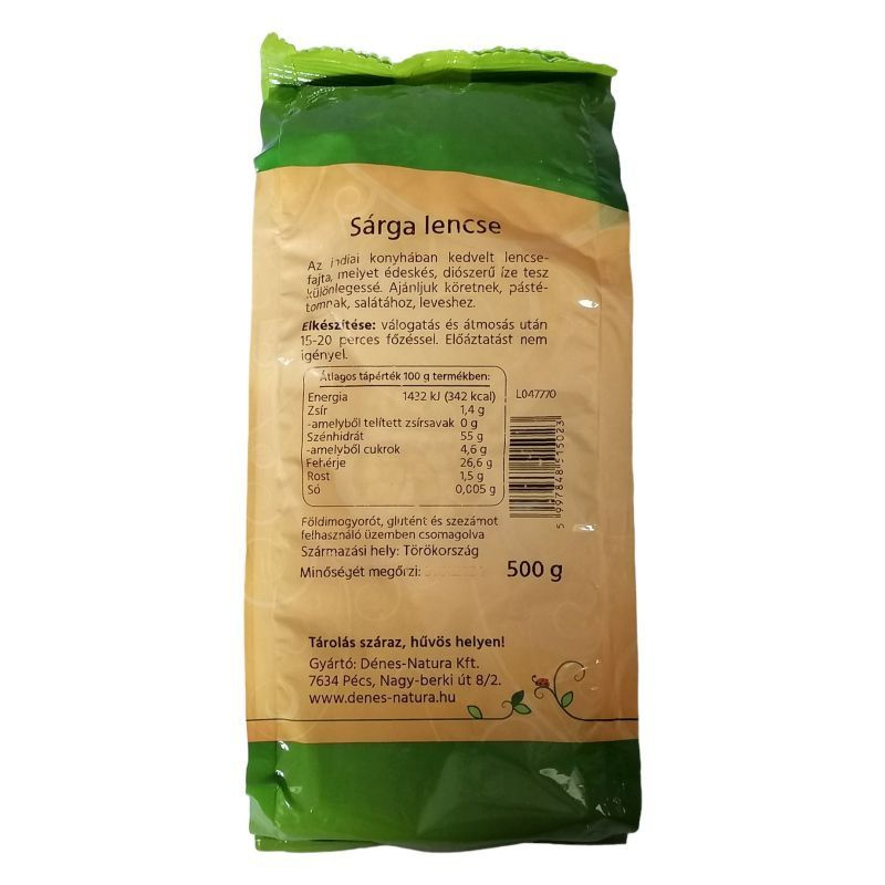 Ajánljuk köretként, pástétomnak, salátához, leveshez. Főzési idő: 5-10 perc. Összetevők: sárga lencse. Átlagos tápanyagtartalom 100g termékben: energiatartalom: 1441 kJ/340 kcal, fehérje: 24,7 g, szénhidrát: 22g, zsír: 1,1g.
