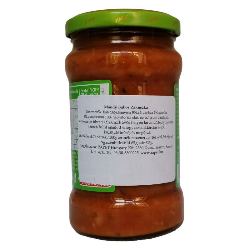 A Mandy zakuszka babos zöldségpástétom egy ízletes és tápláló alternatíva a mindennapi étkezésekhez. Ez a 300 g-os kiszerelésű pástétom gazdag zöldségekben és babban, így nemcsak finom, hanem egészséges választás is. A zakuszka egy hagyományos kelet-európai étel, amelyet sokan kedvelnek, és amelyet könnyedén beilleszthetünk a napi étrendünkbe. A pástétom krémes állaga és gazdag ízvilága lehetővé teszi, hogy különféle ételekhez felhasználjuk, legyen szó szendvicsekről, salátákról vagy akár önálló étkezésről. A Mandy zakuszka tökéletes választás lehet vegetáriánusok és vegánok számára is, hiszen húsmentes összetevőkből készült, így mindenki számára elérhető ízletes élményt nyújt.