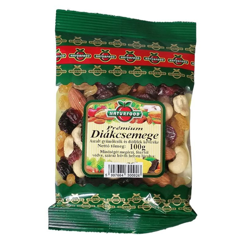 A diákcsemege pörkölt földimogyorót, kesudiót, mandulát, török mogyorót, mazsolát, aszalt szilvát és aszalt sárgabarackot tartalmaz.