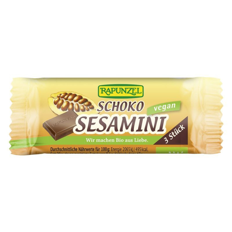 Összetétel: szezám 50%, rizskeményítőszirup, nádcukor, félédes csokoládébevonat 26% nádcukor, kakaómassza, kakaóvaj