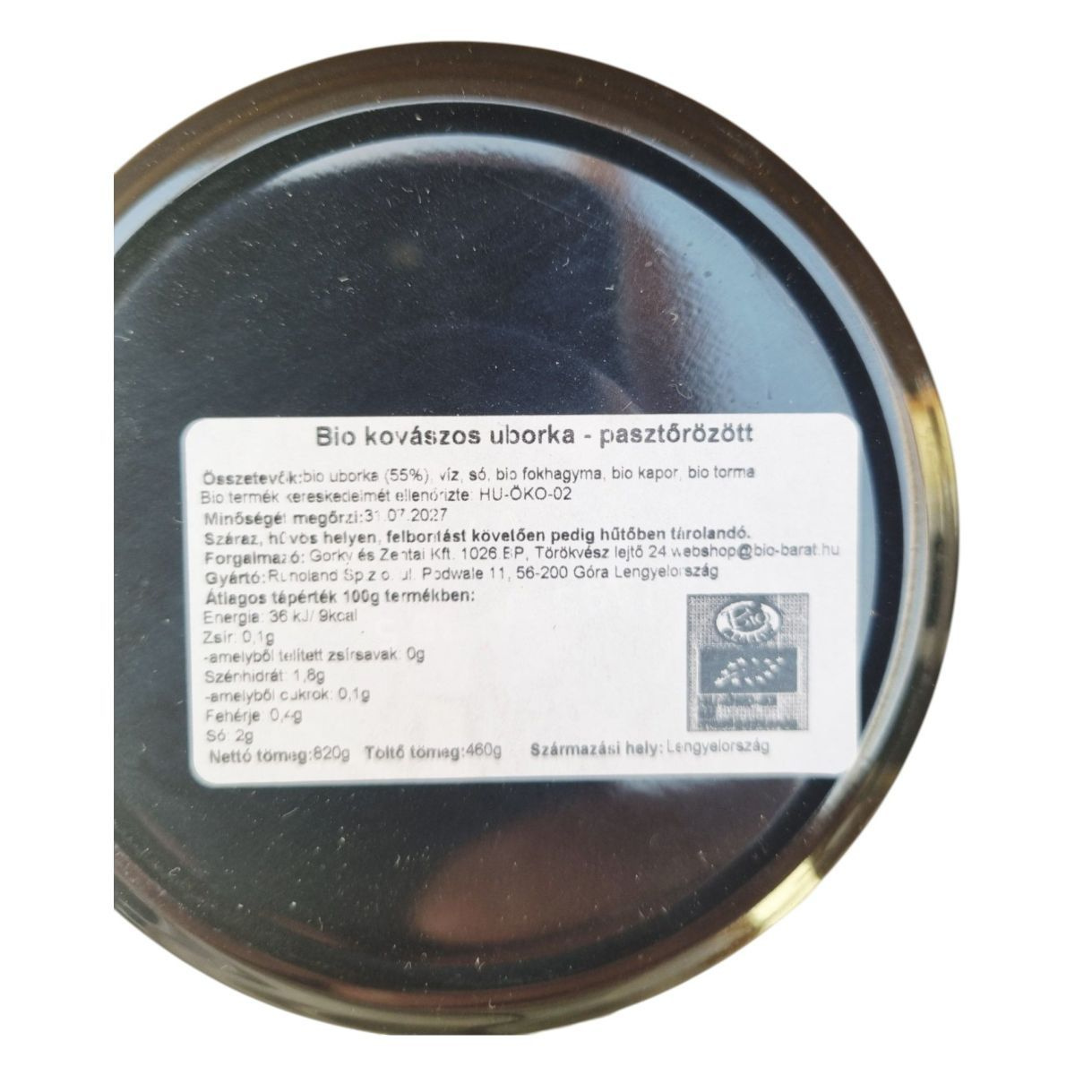 Bio uborka (55%), víz, só, bio fokhagyma, bio kapor, bio torma.