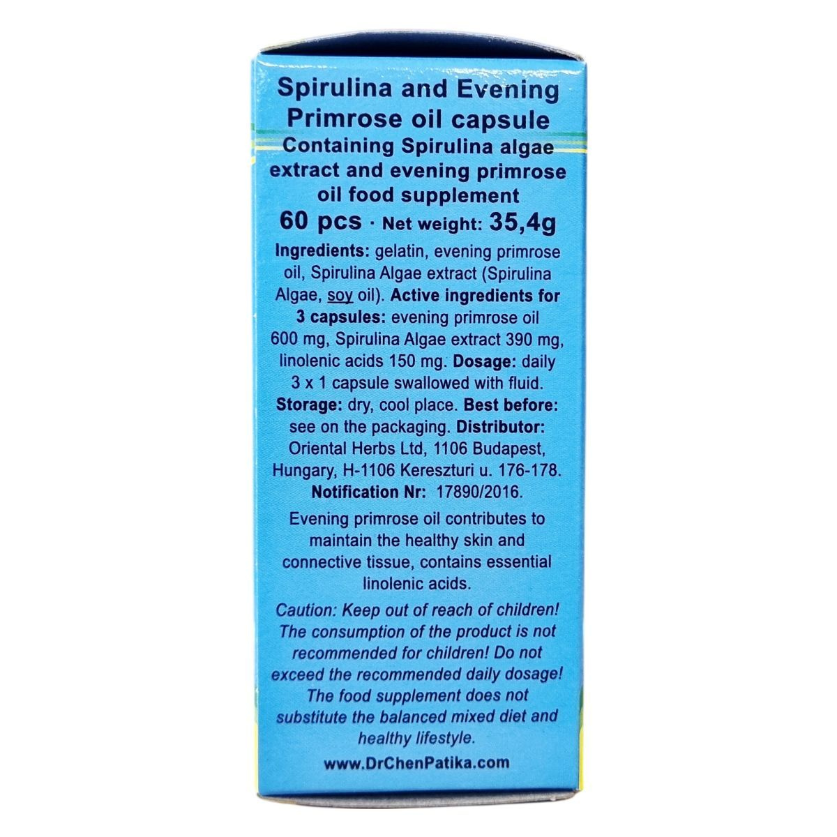 A Dr. Chen Patika algás ligetszépe kapszula 100%-ban természetes spirulina alga és ligetszépe olaj lágyzselatin kapszula formában. Kizárólag természetes összetevőket tartalmaz, így hozzájárulhat a bőr és kötőszövet egészségének fenntartásához. A spirulina alga kivonat mellett a ligetszépe olaj esszenciális linolénsavakat tartalmaz, melyek kedvezően hathatnak a szervezet működésére. A termék nettó tömege 35,4 g, és ajánlott napi adagja három kapszula, amely könnyen beilleszthető a mindennapi étrendbe. Tárolása száraz, hűvös helyen javasolt. A kapszulák gyártója és forgalmazója az Oriental Herbs Kft., amely 1994 óta kínál minőségi termékeket. A fogyasztás előtt mindig vegye figyelembe az ajánlott mennyiséget, valamint tartsa távol gyermekektől. Ez az étrend-kiegészítő nem helyettesíti a kiegyensúlyozott étrendet és az egészséges életmódot.