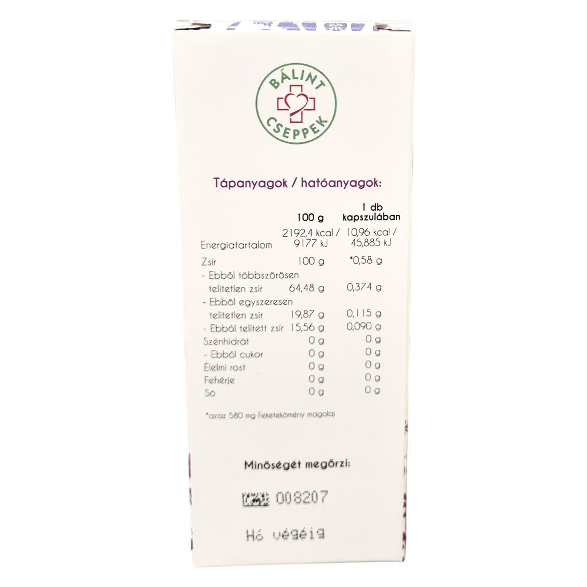 A BÁLINT Cseppek Feketekömény magolaj kapszula Magyarországon készül, 100%-os Nigella sativa magolajból, amelyet hidegen sajtolnak. A termék 580 mg feketekömény magolajat tartalmaz kapszulánként, amelyek zselatinból és vízből állnak. A csomagolás 50 darab kapszulát tartalmaz, nettó tömege 34 gramm. A termék természetéből adódóan előfordulhat benne üledék, amely nem befolyásolja hatását. A tárolást illetően fontos, hogy a készítményt szobahőmérsékleten, fénytől védett, hűvös helyen tartsuk, gyermekek elől elzárva. Az ajánlott napi fogyasztás 1 kapszula, és az étrend-kiegészítő nem helyettesíti a kiegyensúlyozott étrendet és az egészséges életmódot.