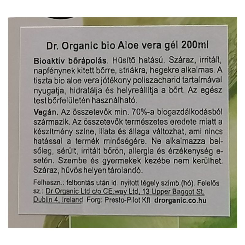 A 100%-os tisztaságú, kíméletes eljárással, kézzel filézett aloe verából származó, bioaktív Aloe Vera gél használata során a növény jótékony hatású poliszacharid tartalma maximálisan érvényesül. Megnyugtatja a bőrt, segít a sejtek állapotának helyreállításában. Nem tartalmaz: Parabeneket, SLS-t, mesterséges színezéket, illatanyagot és tartósítószert.