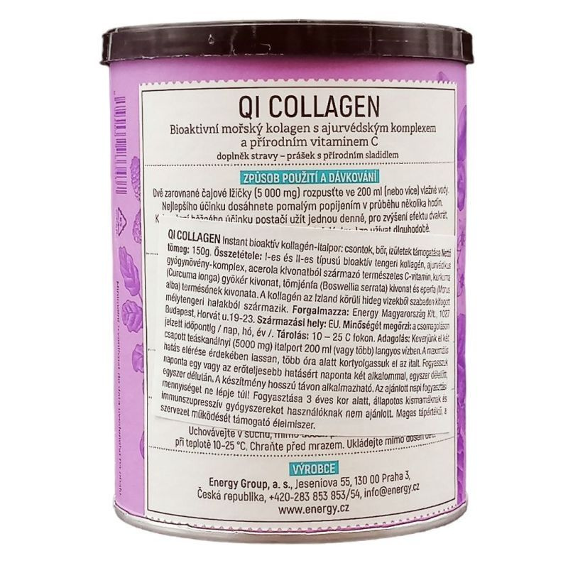 A QI Collegen I-es és II-es típusú bioaktív tengeri halkollagént, ajurvédikus gyógynövény-komplexet, acerolából kivonat természetes C-vitamint, Boswelia serrata-t (tömjénfát) és a Curcuma longa-t (kurkuma) tartalmaz.