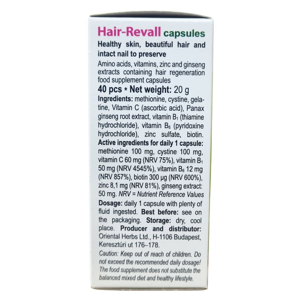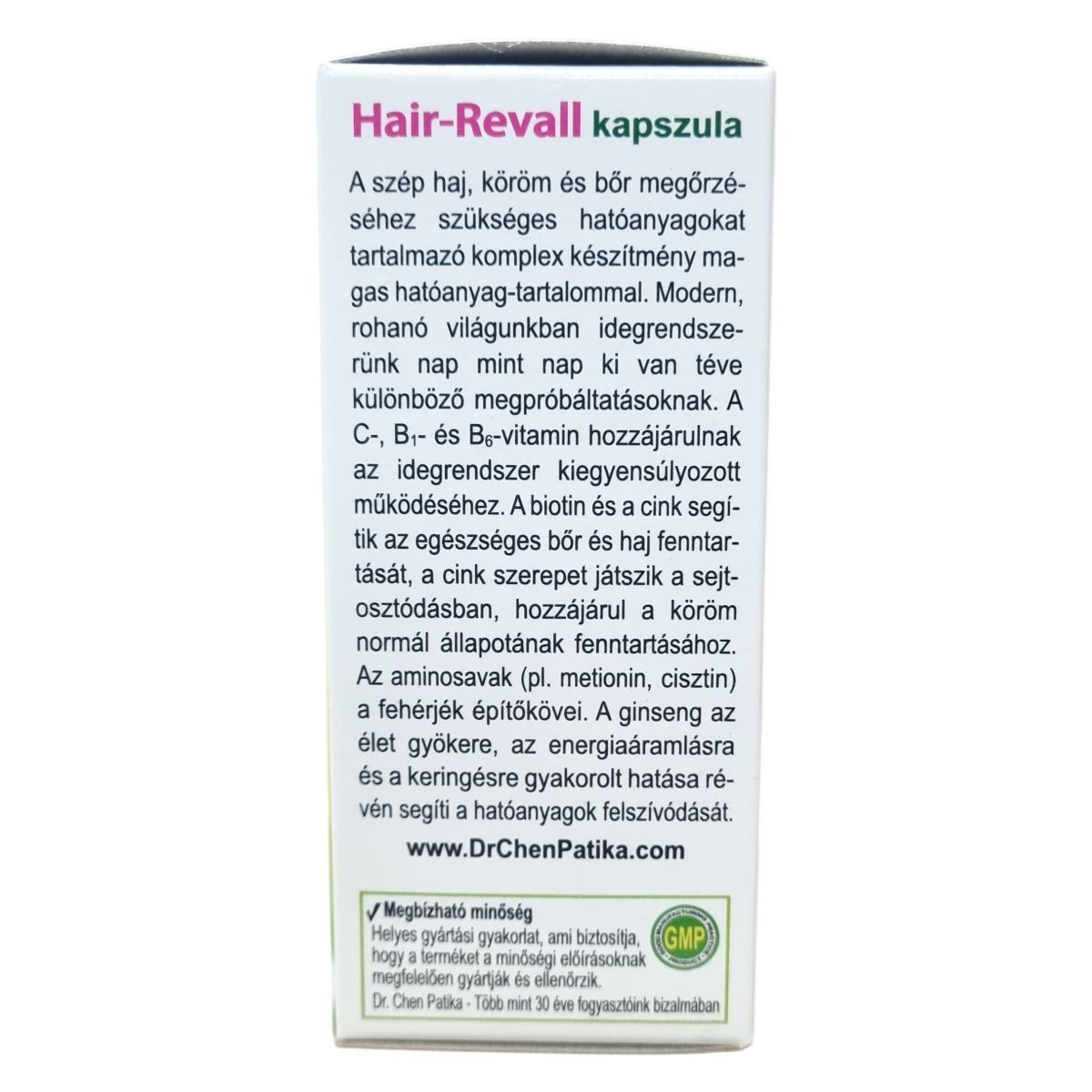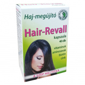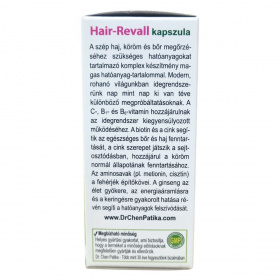 A Hair-Revall kapszula aminosavakat, vitaminokat, cinket és ginseng-kivonatot tartalmazó hajregeneráló étrend-kiegészítő, amely magas hatóanyag-tartalommal készült. A C-, B1- és B6-vitaminok hozzájárulhatnak az idegrendszer kiegyensúlyozott működéséhez, míg a biotin és a cink támogathatja az egészséges bőr és haj fenntartását. A cink szerepet játszhat a sejtosztódásban, és hozzájárulhat a köröm normál állapotának fenntartásához. Az aminosavak, például a metionin és cisztin, a fehérjék építőkövei. A ginseng kivonat az energiaáramlásra és a keringésre gyakorolt hatása révén segítheti a hatóanyagok felszívódását, így hozzájárulhat a szép haj, a bőr és az ép köröm megőrzéséhez. A termék megbízható minőségű, a helyes gyártási gyakorlatnak megfelelően készül, a Dr. Chen Patika több mint 30 éve törekszik fogyasztói bizalomra.