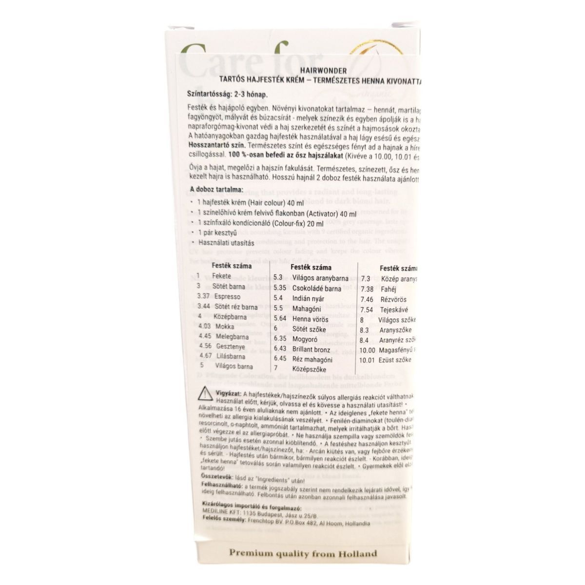 A Hair wonder PREMIUM PERMANENT COLOUR hajfesték krém természetes henna kivonattal készült, amely tartós színt és ápolást biztosíthat a hajnak. A termék 100%-os ősz hajszál fedést ígér, és akár 2-3 hónapig is megőrizheti színét.