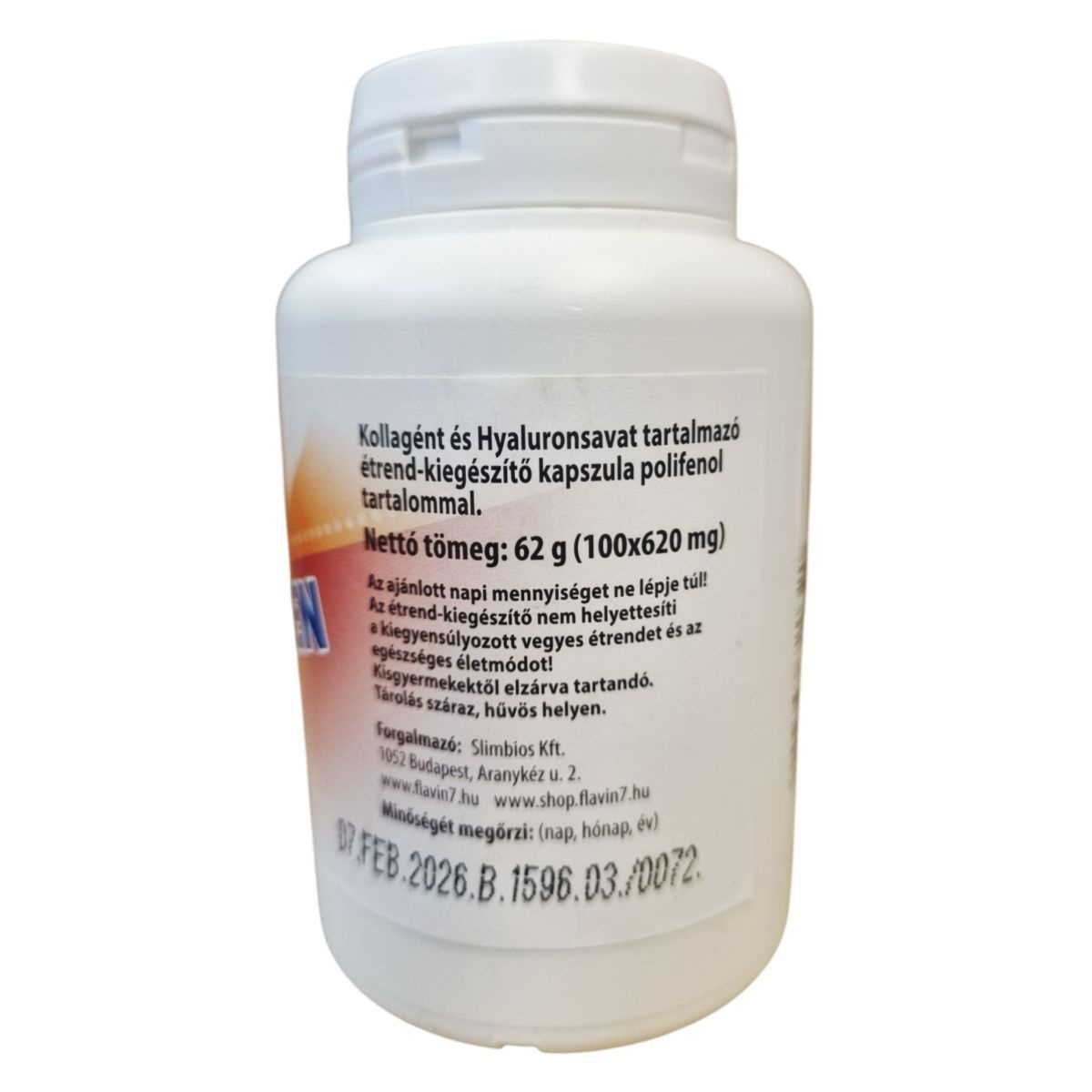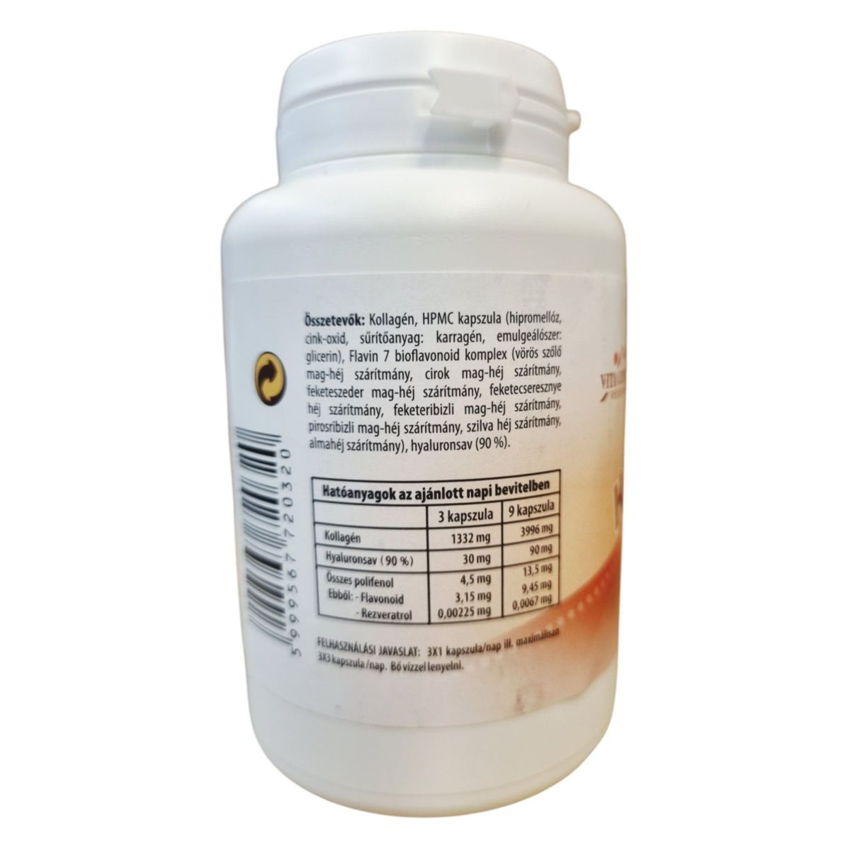 Kollagént és hyaluronsavat tartalmazó étrend-kiegészítő, amely polifenol tartalmával hozzájárulhat a bőr rugalmasságának és hidratáltságának támogatásához.