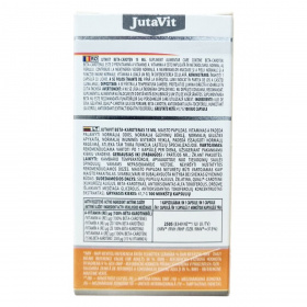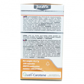 A JutaVit Beta-carotene kapszula 15 mg beta-karotint tartalmaz, amely az A-vitamin provitaminja. Az A-vitamin részt vesz a normál vasanyagcserében, szerepet játszhat a sejtek differenciálódásában, valamint hozzájárulhat a normál látás, a bőr és nyálkahártyák állapotának fenntartásához és az immunrendszer megfelelő működéséhez. A készítmény kizárólag étrend-kiegészítőként szolgál, és nem helyettesítheti a változatos étrendet. Az ajánlott napi mennyiséget nem szabad túllépni. A terméket nem javasolt dohányzóknak és azbesztnek kitett személyeknek fogyasztani. A kapszulák szójaolajat és zselatint tartalmaznak, antioxidánsként alfa-tokoferolt és tokoferolban gazdag kivonatot alkalmaznak. A doboz 100 kapszulát tartalmaz, nettó tömeg 41,7 g. A kapszulát napi egy alkalommal, bő vízzel kell bevenni.