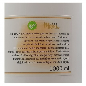 A Fair Trade (méltányos kereskedelem) irányelvei szerint készült bevizsgált termék. Alapvető hatása, hogy a bőrt finomabbá teszi, a ráncokat lágyítja, a bőrirritációkat, pattanásokat csökkenti. A benne található E-vitamin és béta-karotin bőrpuhító, regeneráló hatású. További felhasználási lehetőségek közé sorolható az ekcéma és pikkelysömör tüneteinek csökkentése. A natúr shea vaj fent leírt összetevői miatt magában is, és natúr kozmetikum receptúrák részeként is kiválóan ápolja a száraz, neurodermitiszes, ekcémás bőrt.